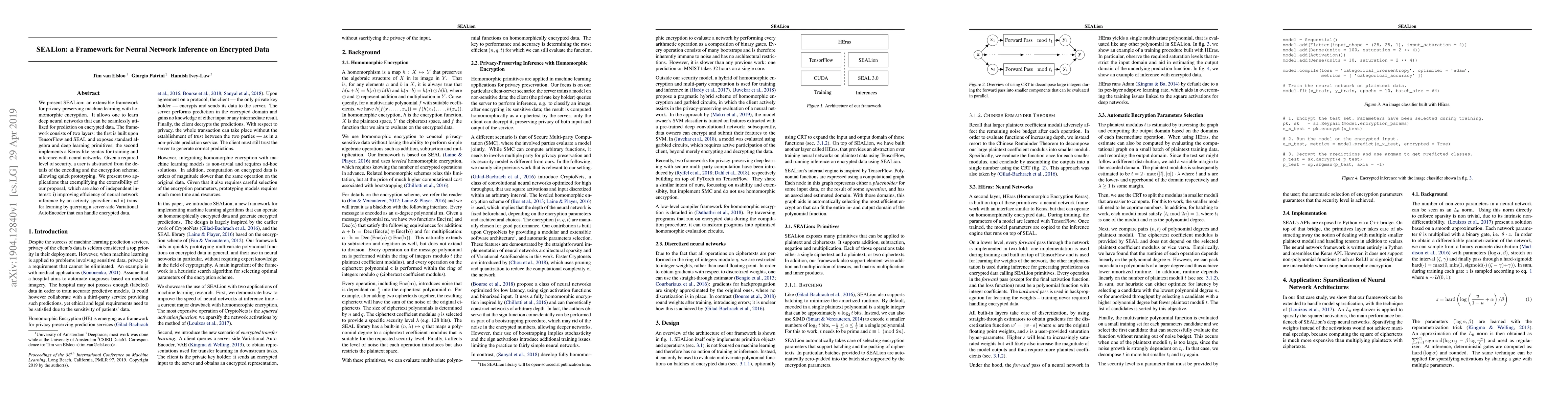 SEALion is a framework for privacy-preserving machine learning using homomorphic encryption, enabling deep neural network inference on encrypted data. It abstracts users from encryption details, allowing for quick prototyping and supporting applications like efficiency improvements and transfer learning.