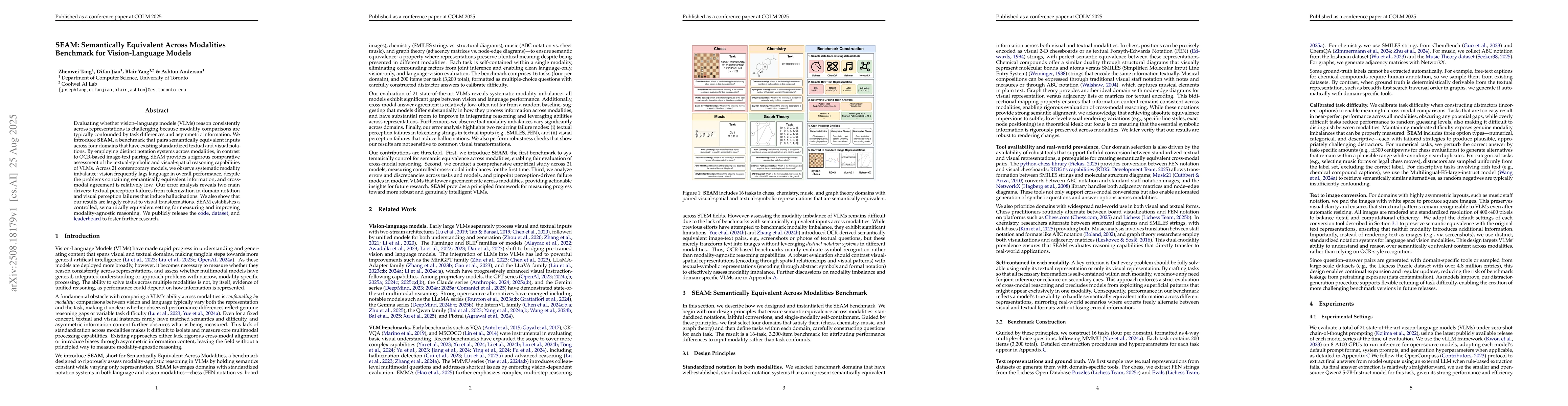 Evaluating whether vision-language models (VLMs) reason consistently across representations is challenging because modality comparisons are typically confounded by task differences and asymmetric information. We introduce SEAM, a benchmark that pairs semantically equivalent inputs across four domains that have existing standardized textual and visual notations. By employing distinct notation systems across modalities, in contrast to OCR-based image-text pairing, SEAM provides a rigorous comparative assessment of the textual-symbolic and visual-spatial reasoning capabilities of VLMs. Across 21 contemporary models, we observe systematic modality imbalance: vision frequently lags language in overall performance, despite the problems containing semantically equivalent information, and cross-modal agreement is relatively low. Our error analysis reveals two main drivers: textual perception failures from tokenization in domain notation and visual perception failures that induce hallucinations. We also show that our results are largely robust to visual transformations. SEAM establishes a controlled, semantically equivalent setting for measuring and improving modality-agnostic reasoning.
