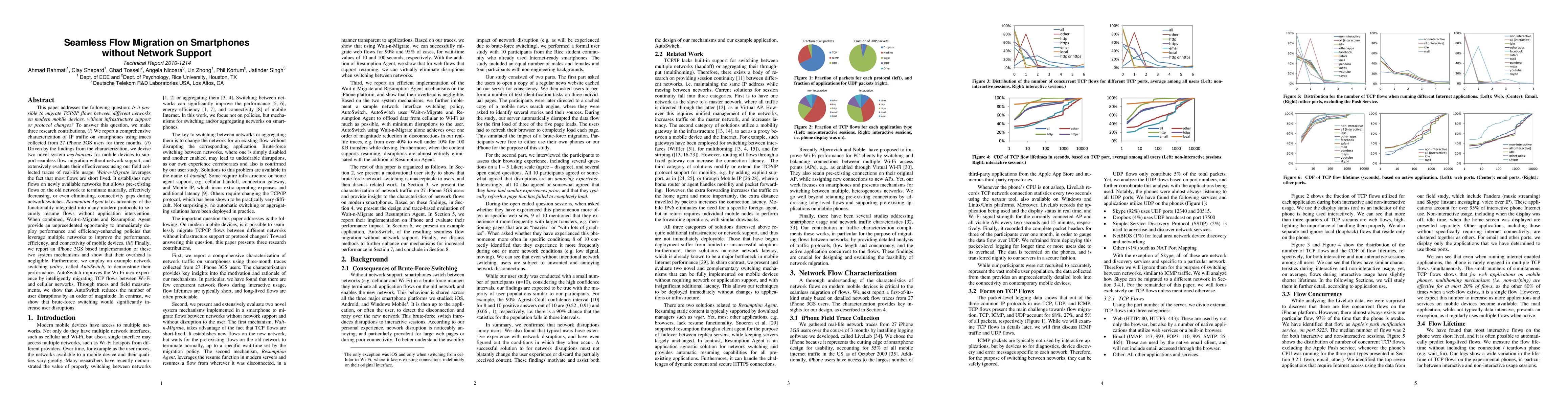 This paper addresses the following question: Is it possible to migrate TCP/IP flows between different networks on modern mobile devices, without infrastructure support or protocol changes? To answer this question, we make three research contributions. (i) We report a comprehensive characterization of IP traffic on smartphones using traces collected from 27 iPhone 3GS users for three months. (ii) Driven by the findings from the characterization, we devise two novel system mechanisms for mobile devices to sup-port seamless flow migration without network support, and extensively evaluate their effectiveness using our field collected traces of real-life usage. Wait-n-Migrate leverages the fact that most flows are short lived. It establishes new flows on newly available networks but allows pre-existing flows on the old network to terminate naturally, effectively decreasing, or even eliminating, connectivity gaps during network switches. Resumption Agent takes advantage of the functionality integrated into many modern protocols to securely resume flows without application intervention. When combined, Wait-n-Migrate and Resumption Agent provide an unprecedented opportunity to immediately deploy performance and efficiency-enhancing policies that leverage multiple networks to improve the performance, efficiency, and connectivity of mobile devices. (iii) Finally, we report an iPhone 3GS based implementation of these two system mechanisms and show that their overhead is negligible. Furthermore, we employ an example network switching policy, called AutoSwitch, to demonstrate their performance. AutoSwitch improves the Wi-Fi user experience by intelligently migrating TCP flows between Wi-Fi and cellular networks. Through traces and field measurements, we show that AutoSwitch reduces the number of user disruptions by an order of magnitude.
