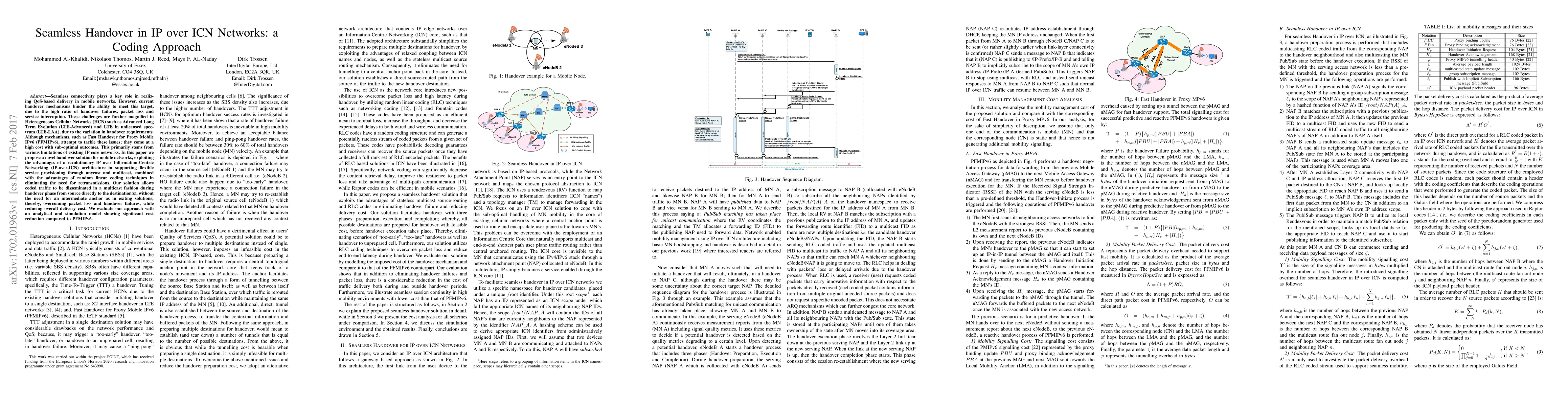 Seamless connectivity plays a key role in realising QoS-based delivery in mobile networks. However, current handover mechanisms hinder the ability to meet this target, due to the high ratio of handover failures, packet loss and service interruption. These challenges are further magnified in Heterogeneous Cellular Networks (HCN) such as Advanced Long Term Evolution (LTE-Advanced) and LTE in unlicensed spectrum (LTE-LAA), due to the variation in handover requirements. Although mechanisms, such as Fast Handover for Proxy Mobile IPv6 (PFMIPv6), attempt to tackle these issues; they come at a high cost with sub-optimal outcomes. This primarily stems from various limitations of existing IP core networks. In this paper we propose a novel handover solution for mobile networks, exploiting the advantages of a revolutionary IP over Information-Centric Networking (IP-over-ICN) architecture in supporting flexible service provisioning through anycast and multicast, combined with the advantages of random linear coding techniques in eliminating the need for retransmissions. Our solution allows coded traffic to be disseminated in a multicast fashion during handover phase from source directly to the destination(s), without the need for an intermediate anchor as in exiting solutions; thereby, overcoming packet loss and handover failures, while reducing overall delivery cost. We evaluate our approach with an analytical and simulation model showing significant cost reduction compared to PFMIPv6.