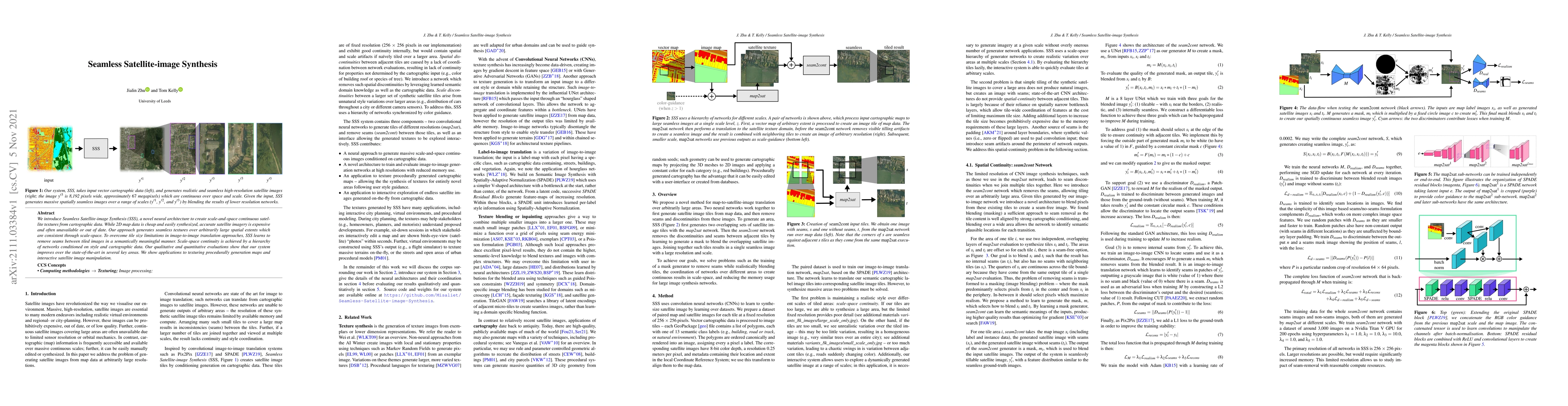 The paper presents Seamless Satellite-image Synthesis (SSS), a neural architecture that generates large, scale-and-space continuous satellite textures from cartographic data, overcoming tile size limitations and achieving scale-space continuity through a hierarchy of conditioned networks. The method demonstrates superior performance over existing techniques and enables applications like procedural map texturing and interactive satellite image manipulation.