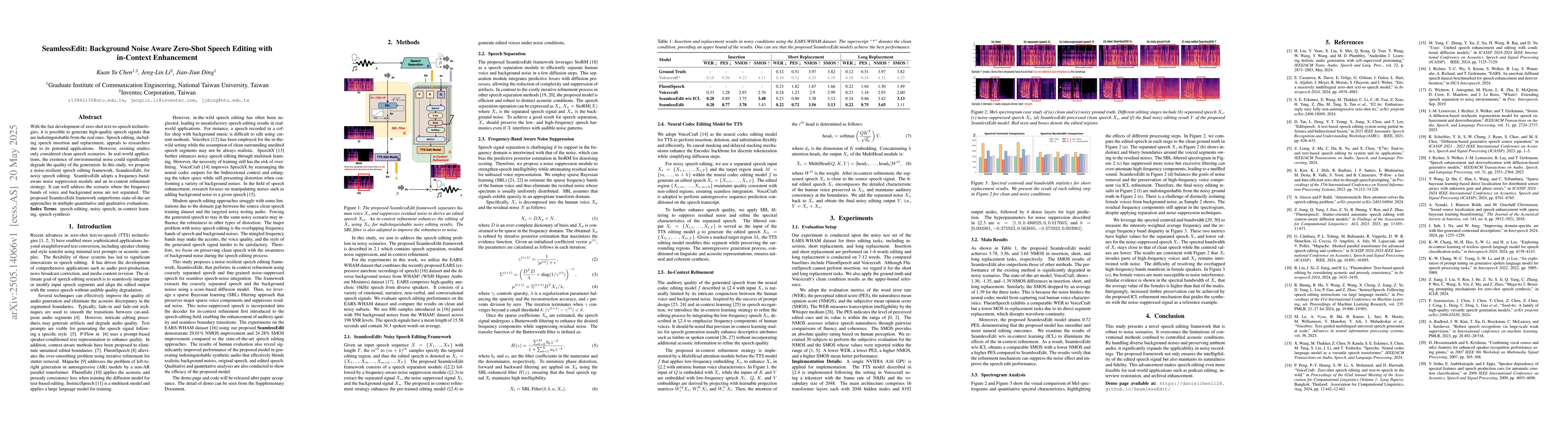 The main technical contribution is the SeamlessEdit framework, which combines a frequency-band-aware noise suppression module with an in-context refinement strategy for effective noisy speech editing.