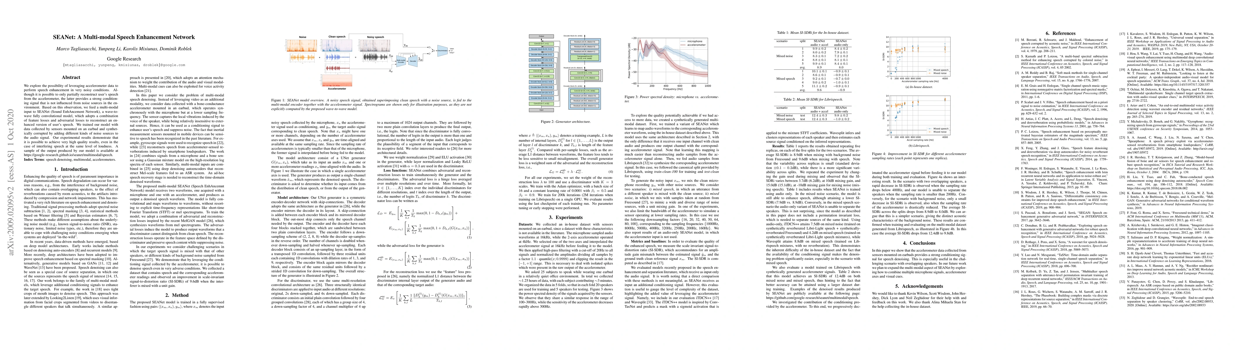 We explore the possibility of leveraging accelerometer data to perform speech enhancement in very noisy conditions. Although it is possible to only partially reconstruct user's speech from the accelerometer, the latter provides a strong conditioning signal that is not influenced from noise sources in the environment. Based on this observation, we feed a multi-modal input to SEANet (Sound EnhAncement Network), a wave-to-wave fully convolutional model, which adopts a combination of feature losses and adversarial losses to reconstruct an enhanced version of user's speech. We trained our model with data collected by sensors mounted on an earbud and synthetically corrupted by adding different kinds of noise sources to the audio signal. Our experimental results demonstrate that it is possible to achieve very high quality results, even in the case of interfering speech at the same level of loudness. A sample of the output produced by our model is available at https://google-research.github.io/seanet/multimodal/speech.