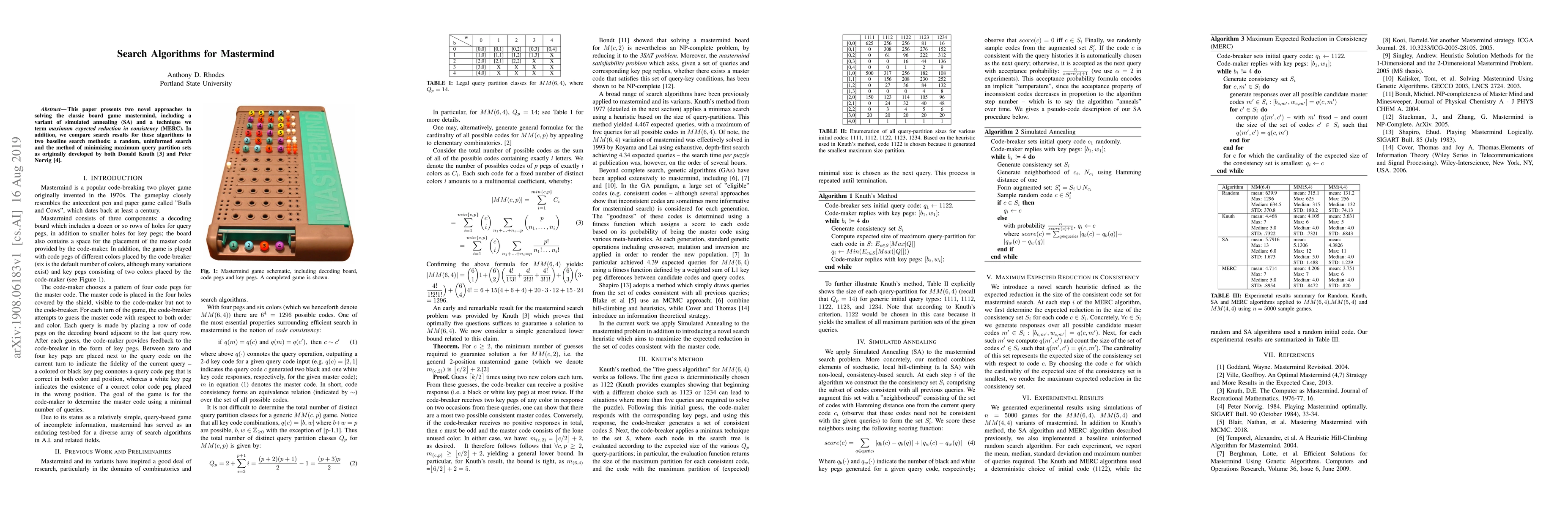 his paper presents two novel approaches to solving the classic board game mastermind, including a variant of simulated annealing (SA) and a technique we term maximum expected reduction in consistency (MERC). In addition, we compare search results for these algorithms to two baseline search methods: a random, uninformed search and the method of minimizing maximum query partition sets as originally developed by both Donald Knuth and Peter Norvig.