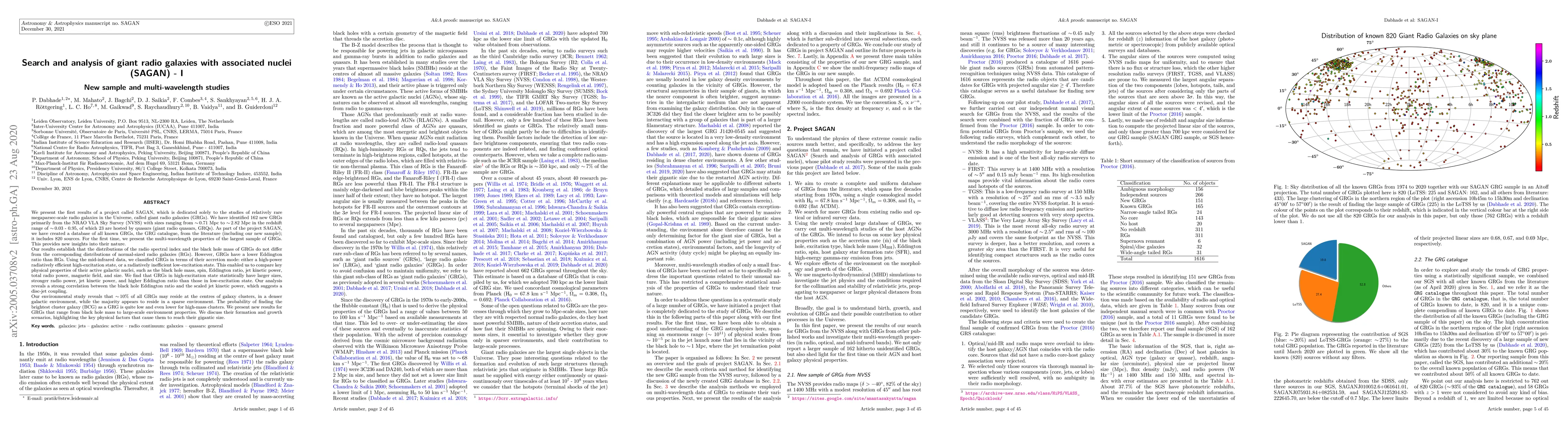 We present the first results of a project called SAGAN, which is dedicated solely to the studies of relatively rare megaparsec-scale radio galaxies in the Universe, called giant radio galaxies (GRGs). We have identified 162 new GRGs primarily from the NVSS with sizes ranging from ~0.71 Mpc to 2.82 Mpc in the redshift range of ~0.03 - 0.95, of which 23 are hosted by quasars (giant radio quasars, GRQs). As part of the project SAGAN, we have created a database of all known GRGs, the GRG catalogue, from the literature (including our new sample); it includes 820 sources. For the first time, we present the multi-wavelength properties of the largest sample of GRGs. Our results establish that the distributions of the radio spectral index and the black hole mass of GRGs do not differ from the corresponding distributions of normal-sized radio galaxies (RGs). However, GRGs have a lower Eddington ratio (ER) than RGs. Using the mid-infrared data, we classified GRGs in terms of their accretion mode: either a high-power radiatively efficient high-excitation state, or a radiatively inefficient low-excitation state. We find that GRGs in high-excitation state statistically have larger sizes, stronger radio power, jet kinetic power, and higher ER than those in low-excitation state. Our analysis reveals a strong correlation between the ER and the scaled jet kinetic power, which suggests a disc-jet coupling. Our environmental study reveals that ~10% of all GRGs may reside at the centres of galaxy clusters, in a denser galactic environment, while the majority appears to reside in a sparse environment. We find that the probability of BCG as a GRG is quite low. We present new results for GRGs that range from black hole mass to large-scale environment properties. We discuss their formation and growth scenarios, highlighting the key physical factors that cause them to reach their gigantic size. Abridged.