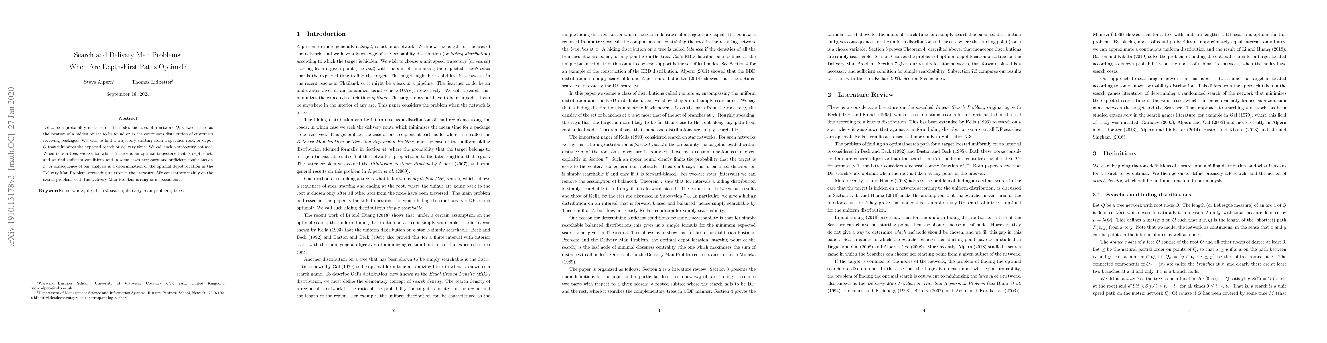 Let h be a probability measure on the nodes and arcs of a network Q, viewed either as the location of a hidden object to be found or as the continuous distribution of customers receiving packages. We wish to find a trajectory starting from a specified root, or depot O that minimizes the expected search or delivery time. We call such a trajectory optimal. When Q is a tree, we ask for which h there is an optimal trajectory that is depth-first, and we find sufficient conditions and in some cases necessary and sufficient conditions on h. A consequence of our analysis is a determination of the optimal depot location in the Delivery Man Problem, correcting an error in the literature. We concentrate mainly on the search problem, with the Delivery Man Problem arising as a special case.