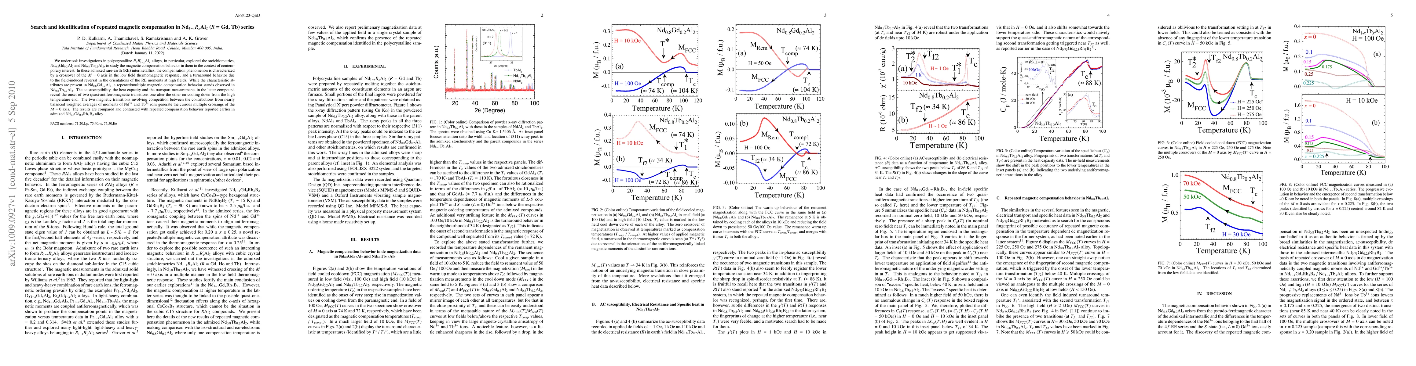 We undertook investigations in polycrystalline R(x)R'(1-x)Al(2) alloys, in particular, explored the stoichiometries, Nd(0.8)Gd(0.2)Al(2) and Nd(0.8)Tb(0.2)Al(2), to study the magnetic compensation behavior in them in the context of contemporary interest. In these admixed rare-earth (RE) intermetallics, the compensation phenomenon is characterized by a crossover of the M = 0 axis in the low field thermomagnetic response, and a turnaround behavior due to the field-induced reversal in the orientations of the RE moments at high fields. While the characteristic attributes are present in Nd(0.8)Gd(0.2)Al(2), a repeated/multiple magnetic compensation behavior stands observed in Nd(0.8)Tb(0.2)Al(2). The ac susceptibility, the heat capacity and the transport measurements in the latter compound reveal the onset of two quasi-antiferromagnetic transitions one after the other on cooling down from the high temperature end. The two magnetic transitions involving competition between the contributions from nearly balanced weighted averages of moments of Nd{3+} and Tb{3+} ions generate the curious multiple crossings of the M = 0 axis. The results are compared and contrasted with repeated compensation behavior reported earlier in admixed Nd(0.8)Gd(0.2)Rh(3)B(2) alloy.