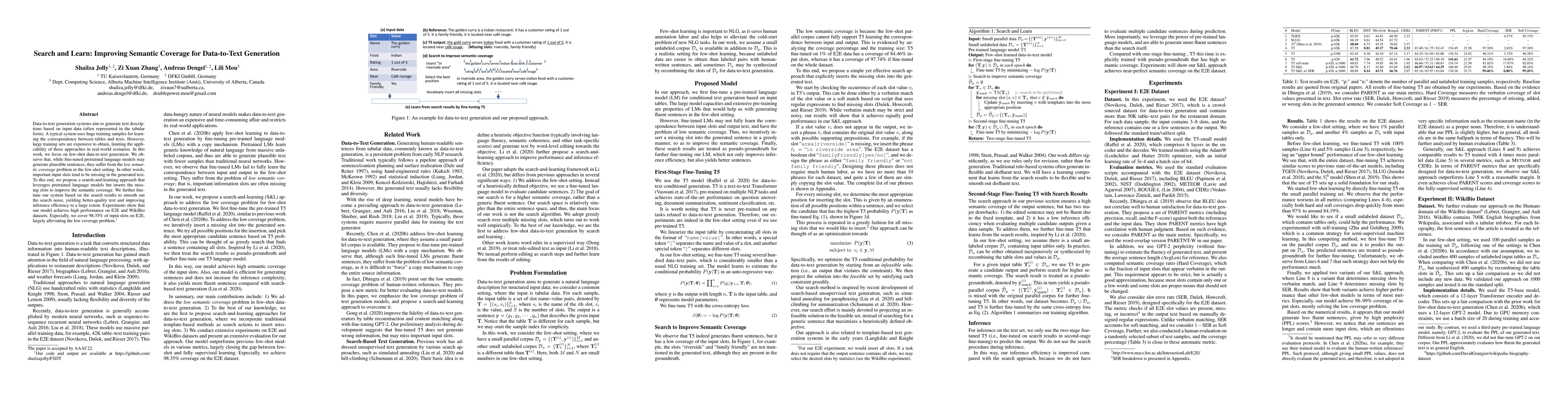 This paper proposes a method for improving semantic coverage in few-shot data-to-text generation by using a search-and-learning approach to identify and insert missing input slots. The approach fine-tunes pretrained language models to enhance text quality and efficiency, achieving high performance and covering 98.35% of input slots on the E2E dataset.