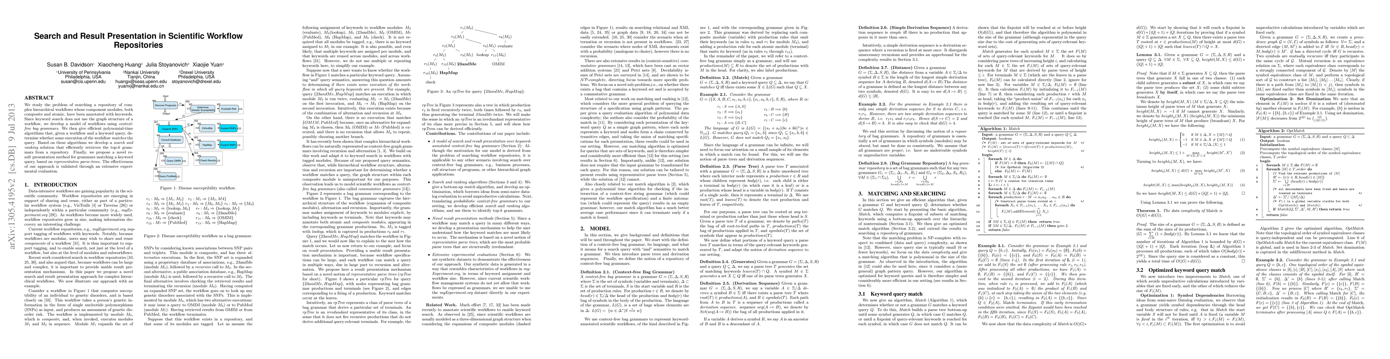 We study the problem of searching a repository of complex hierarchical workflows whose component modules, both composite and atomic, have been annotated with keywords. Since keyword search does not use the graph structure of a workflow, we develop a model of workflows using context-free bag grammars. We then give efficient polynomial-time algorithms that, given a workflow and a keyword query, determine whether some execution of the workflow matches the query. Based on these algorithms we develop a search and ranking solution that efficiently retrieves the top-k grammars from a repository. Finally, we propose a novel result presentation method for grammars matching a keyword query, based on representative parse-trees. The effectiveness of our approach is validated through an extensive experimental evaluation.
