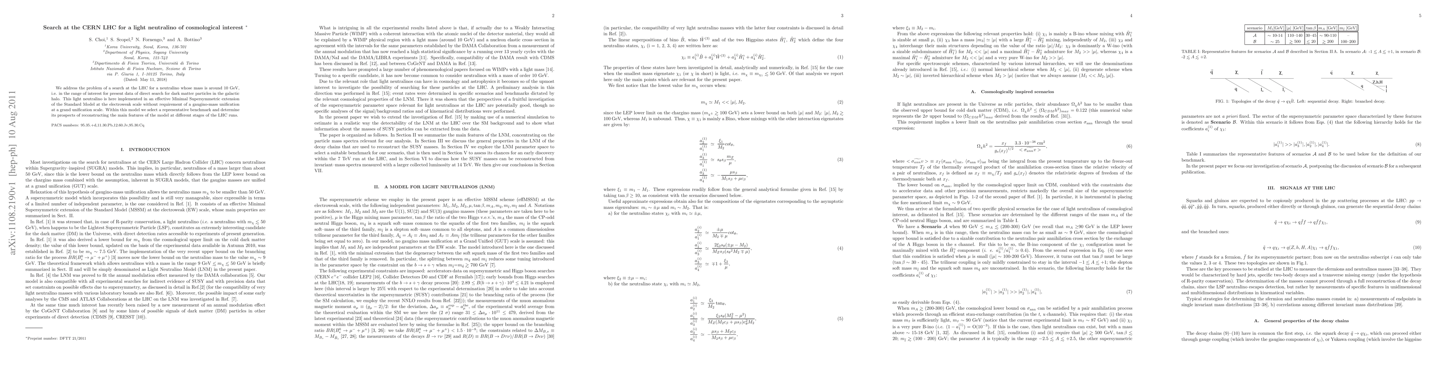 We address the problem of a search at the LHC for a neutralino whose mass is around 10 GeV, i.e. in the range of interest for present data of direct search for dark matter particles in the galactic halo. This light neutralino is here implemented in an effective Minimal Supersymmetric extension of the Standard Model at the electroweak scale without requirement of a gaugino-mass unification at a grand unification scale. Within this model we select a representative benchmark and determine its prospects of reconstructing the main features of the model at different stages of the LHC runs.