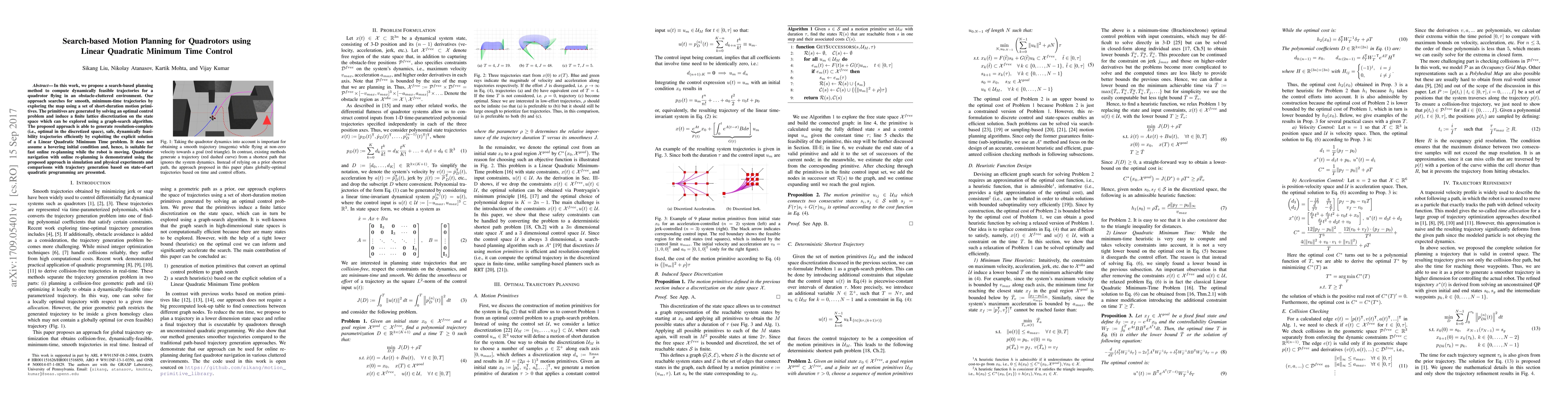 A search-based motion planning method is proposed for quadrotors in obstacle-cluttered environments, using linear quadratic minimum time control to generate smooth, safe trajectories efficiently.