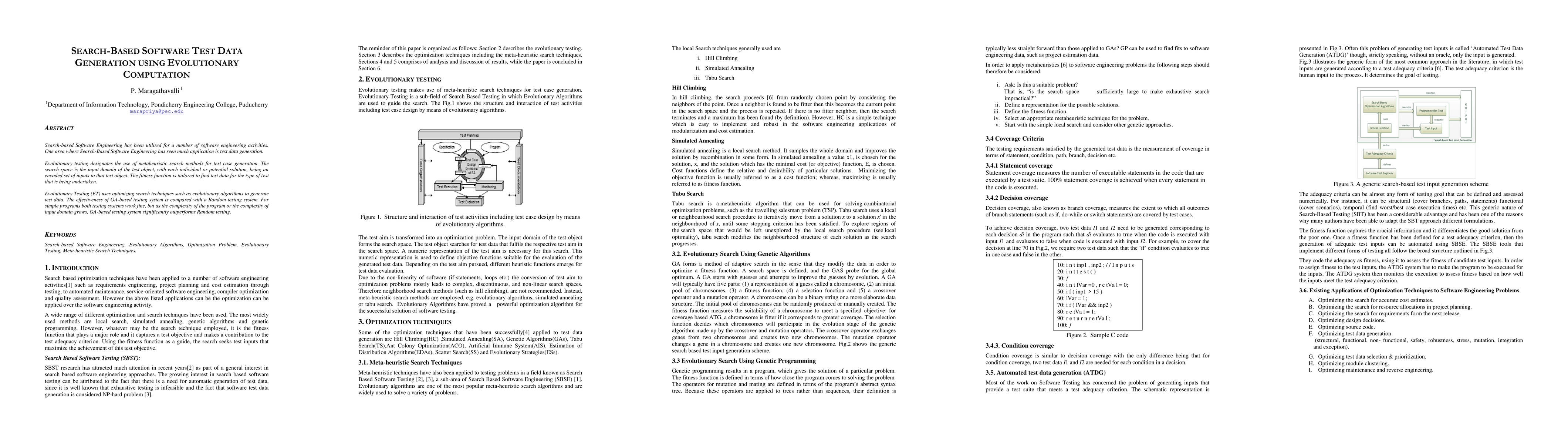 This paper explores the application of evolutionary computation for generating test data in software testing, demonstrating that genetic algorithm-based testing systems outperform random testing, especially for complex programs and input domains.