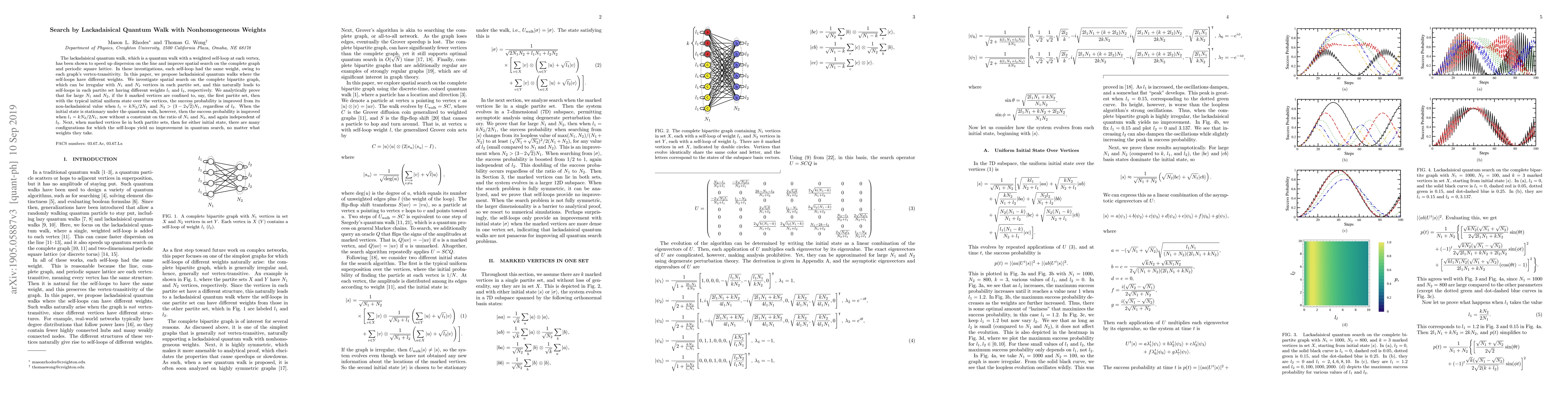 The paper introduces nonhomogeneous lackadaisical quantum walks with different self-loop weights on complete bipartite graphs, analyzing their performance in spatial search problems.