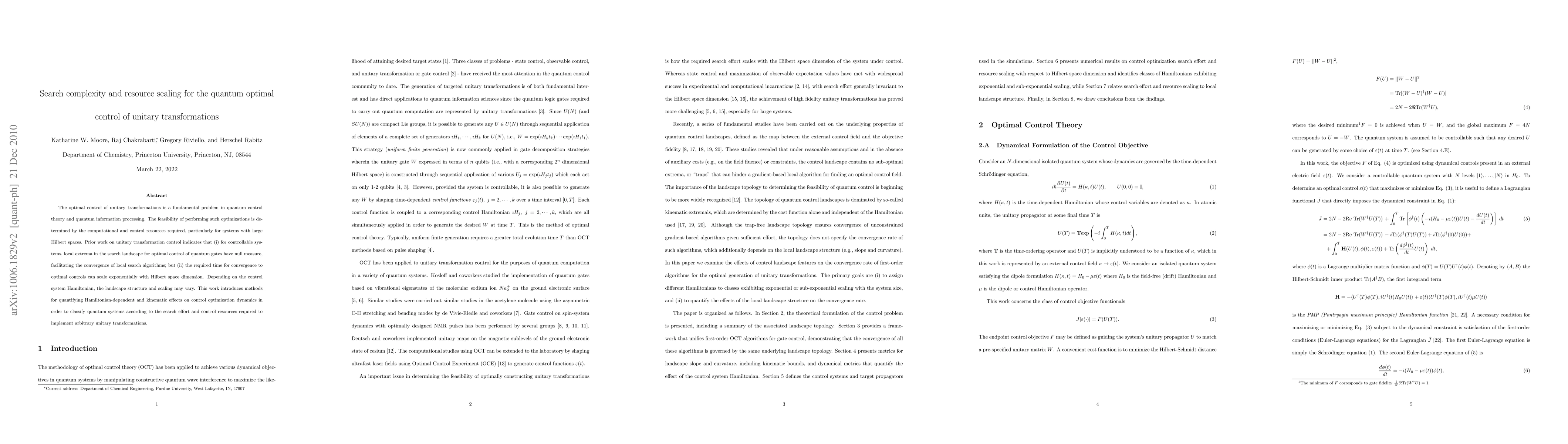 This paper explores the computational and control resources needed for optimal control of unitary transformations in quantum systems, highlighting that while local extrema in the search landscape are rare, convergence time can exponentially increase with system size. It introduces methods to quantify and classify quantum systems based on their search complexity and resource scaling for quantum optimal control.