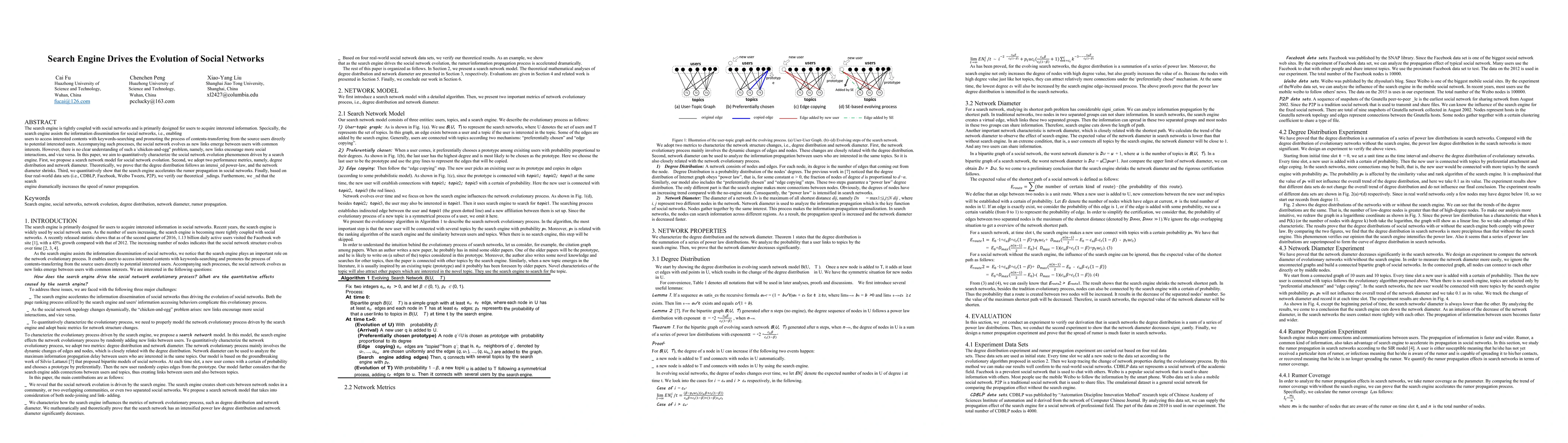 This paper investigates how search engines influence the evolution of social networks by facilitating content dissemination and interaction. It proposes a search network model, demonstrates that the degree distribution follows an intensified power-law and the network diameter shrinks, and verifies these findings using real-world datasets, showing that search engines significantly accelerate rumor propagation.