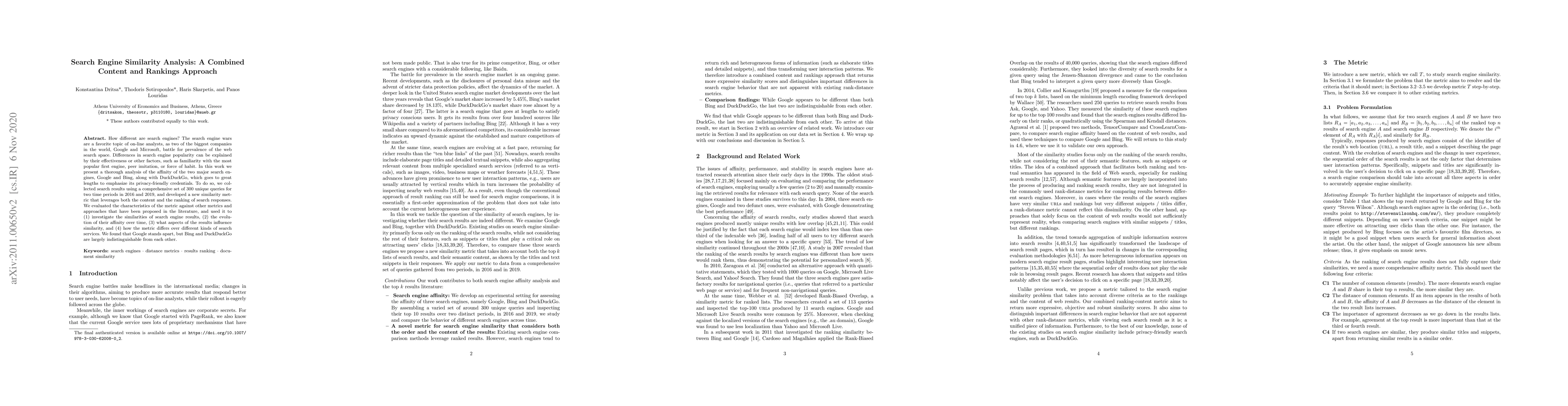 How different are search engines? The search engine wars are a favorite topic of on-line analysts, as two of the biggest companies in the world, Google and Microsoft, battle for prevalence of the web search space. Differences in search engine popularity can be explained by their effectiveness or other factors, such as familiarity with the most popular first engine, peer imitation, or force of habit. In this work we present a thorough analysis of the affinity of the two major search engines, Google and Bing, along with DuckDuckGo, which goes to great lengths to emphasize its privacy-friendly credentials. To do so, we collected search results using a comprehensive set of 300 unique queries for two time periods in 2016 and 2019, and developed a new similarity metric that leverages both the content and the ranking of search responses. We evaluated the characteristics of the metric against other metrics and approaches that have been proposed in the literature, and used it to (1) investigate the similarities of search engine results, (2) the evolution of their affinity over time, (3) what aspects of the results influence similarity, and (4) how the metric differs over different kinds of search services. We found that Google stands apart, but Bing and DuckDuckGo are largely indistinguishable from each other.
