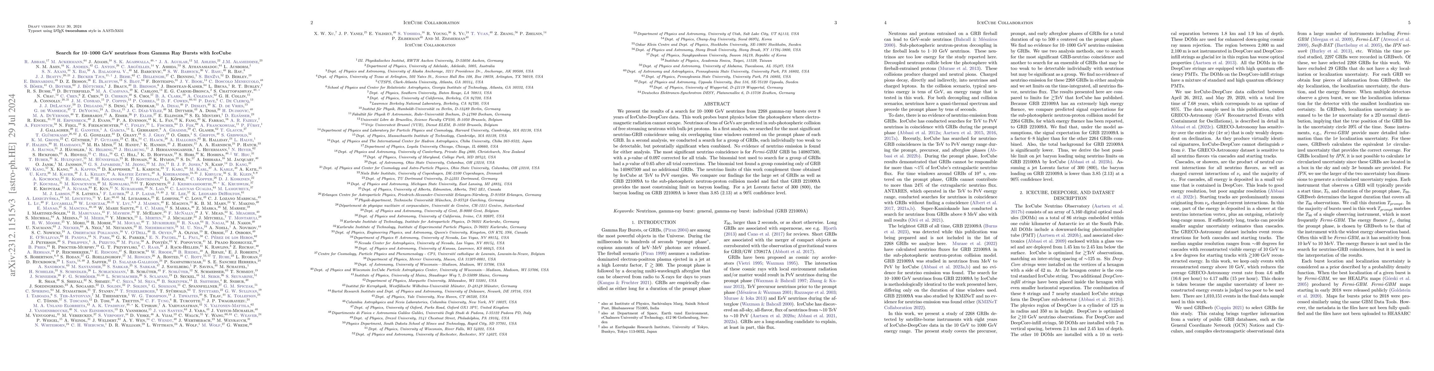 This study analyzes IceCube-DeepCore data from 2,268 gamma-ray bursts (GRBs) to search for 10-1,000 GeV neutrinos, finding no evidence of neutrino emission. The research constrains baryon loading in GRB 221009A, providing limits on the jet's baryon content.