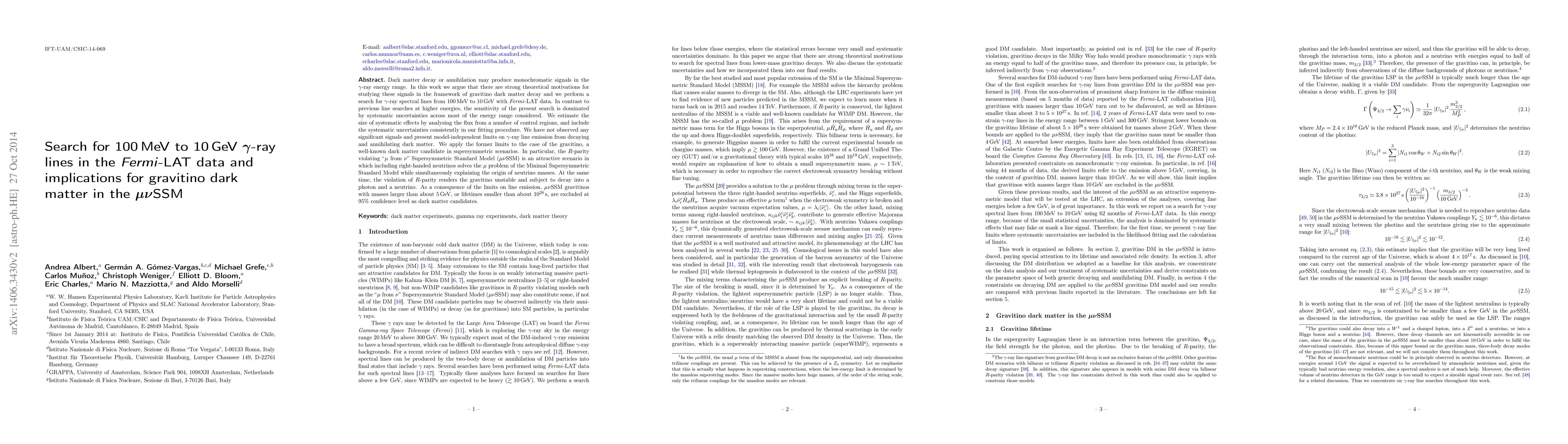 The research paper presents a search for gamma-ray spectral lines in the Fermi-LAT data, focusing on gravitino dark matter in the R-parity violating $mu u$SSM. No significant signals were found, leading to model-independent limits on dark matter gamma-ray line emission. Gravitino dark matter candidates with masses above 5 GeV or lifetimes less than $10^{28}$ seconds are excluded at 95% confidence level as dark matter candidates.