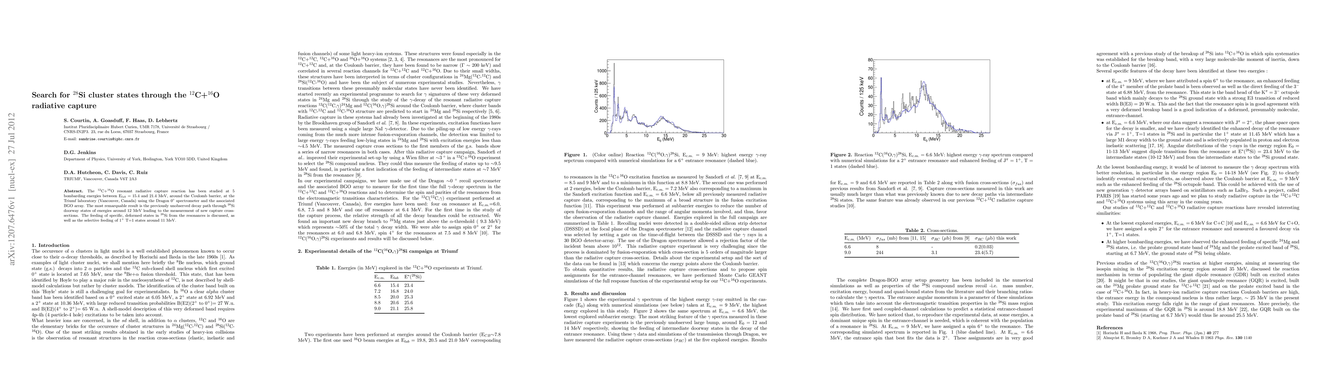 The 12C+16O resonant radiative capture reaction has been studied at 5 bombarding energies between Elab = 15.4 and 21.4 MeV, around the Coulomb barrier, at the Triumf laboratory (Vancouver, Canada) using the Dragon 0{\deg} spectrometer and the associated BGO array. The most remarquable result is the previously unobserved decay path through 28Si doorway states of energies around 12 MeV leading to the measurement of new capture cross-sections. The feeding of specific, deformed states in 28Si from the resonances is discussed, as well as the selective feeding of 1^+ T=1 states around 11 MeV.