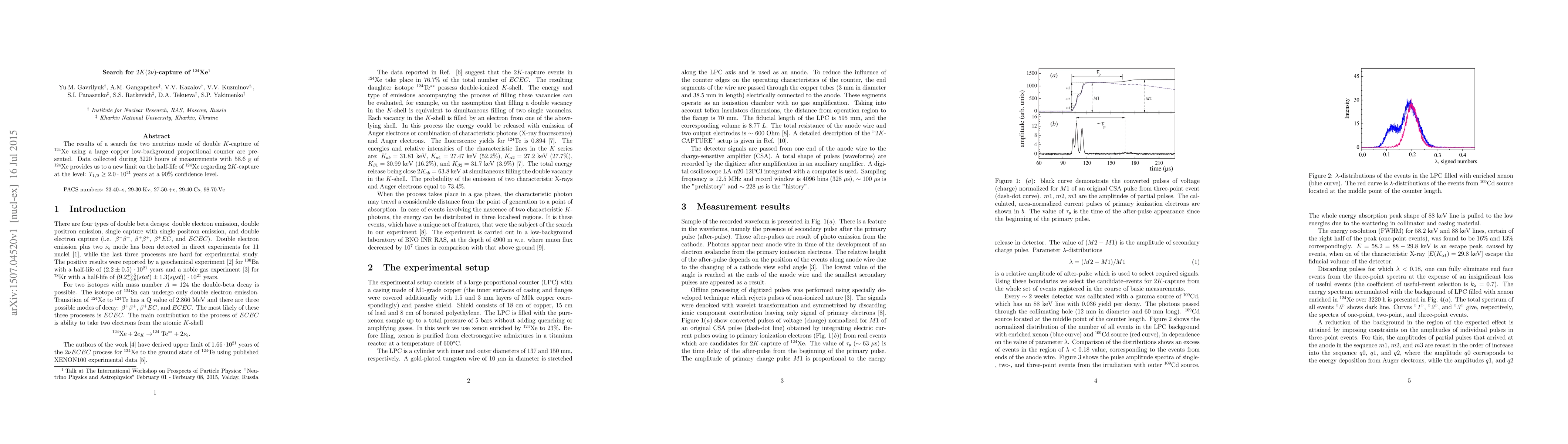 The research sets a new limit on the half-life of Xe-124 for two neutrino double K-capture at 2.0*10^21 years (90% confidence), using a low-background proportional counter and 3220 hours of measurements with 58.6 g of $^{124}$Xe.