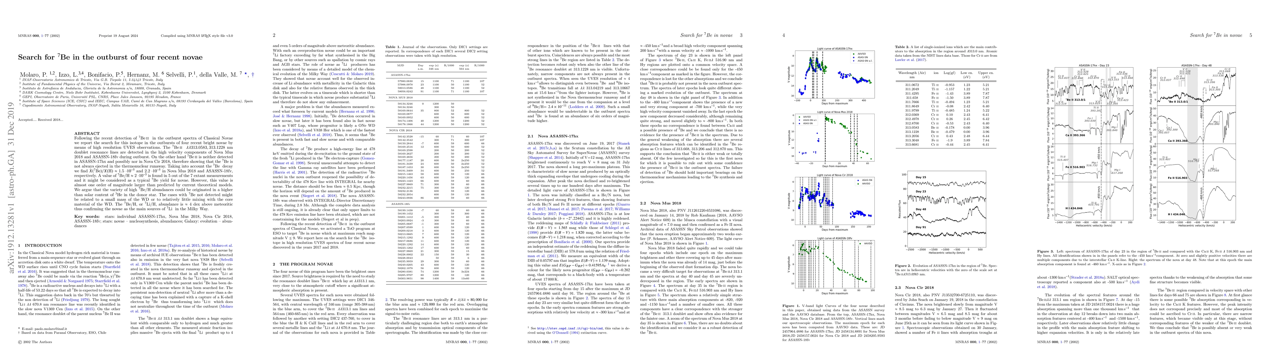Following the recent detection of 7Be in the outburst spectra of Classical Novae we report the search for this isotope in the outbursts of four recent bright novae by means of high resolution UVES observations. The 7BeII 313.0583, 313.1228 nm doublet resonance lines are detected in the high velocity components of Nova Mus 2018 and ASASSN-18fv during outburst. On the other hand 7BeII is neither detected in ASASSN-17hx and possibly nor in Nova Cir 2018, therefore showing that the 7BeII is not always ejected in the thermonuclear runaway. Taking into account the 7Be decay we find X(7Be)/X(H) approx 1.5 x10 ^{-5} and 2.2 x 10 ^{-5} in Nova Mus 2018 and ASASSN-18fv, respectively. A value of 7Be/H about 2 x10 ^{-5} is found in 5 out of the 7 extant measurements and it might be considered as a typical 7Be yield for novae. However, this value is almost one order of magnitude larger than predicted by current theoretical models. We argue that the variety of high 7Be/H abundances could be originated in a higher than solar content of 3He in the donor star. The cases with 7Be not detected might be related to a small mass of the WD or to relatively little mixing with the core material of the WD. The 7Be /H, or 7Li/H, abundance is about 4 dex above meteoritic thus confirming the novae as the main sources of 7Li in the Milky Way.