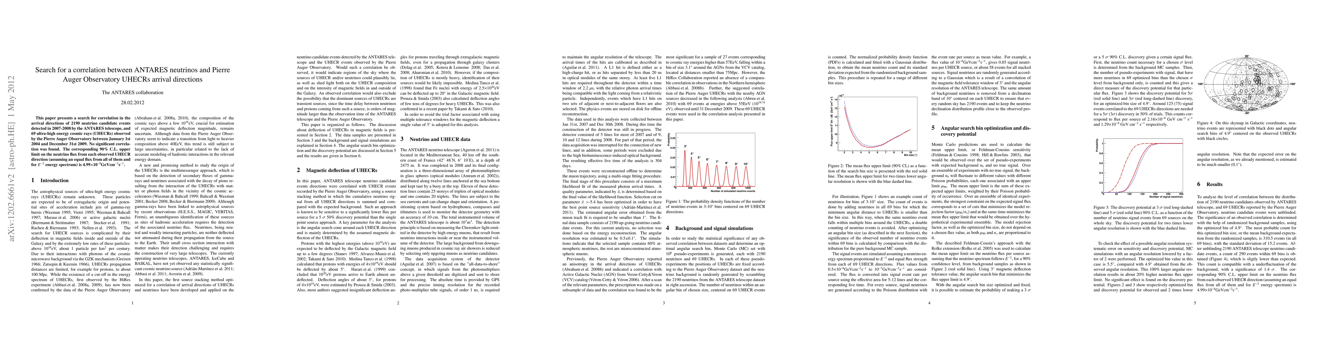 This study investigates a potential correlation between 2190 ANTARES neutrinos and 69 Pierre Auger ultra-high energy cosmic rays, finding no significant correlation. The research sets a 90% C.L. upper limit on neutrino flux from UHECR directions at 4.99×10$^{-8}$ GeV cm$^{-2}$ s$^{-1}$.