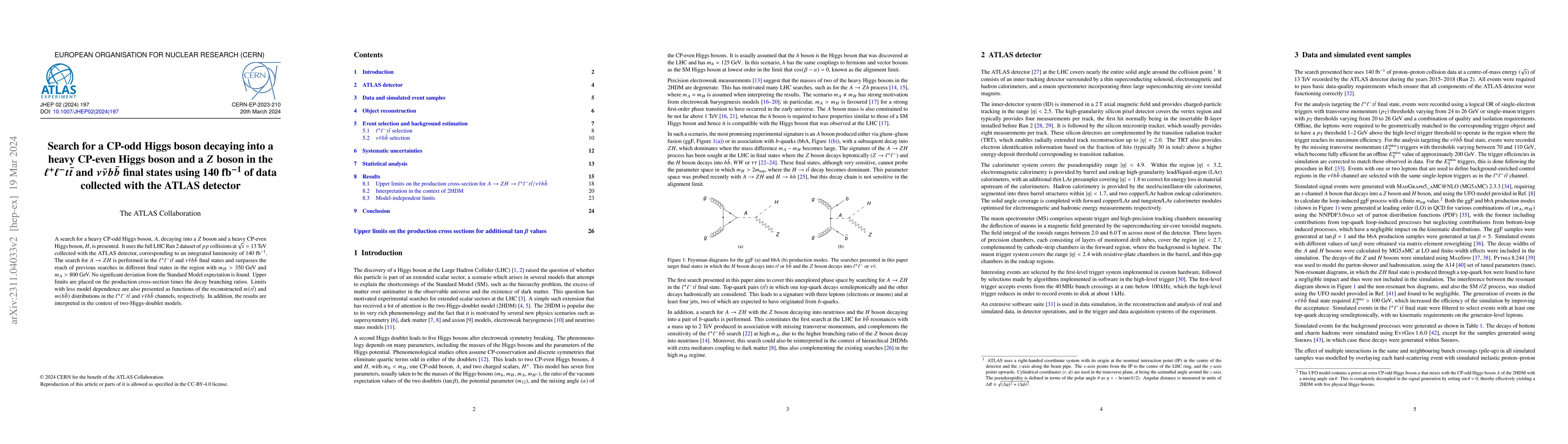 The ATLAS collaboration searched for a CP-odd Higgs boson decaying into a CP-even Higgs boson and a $Z$ boson using 140 fb$^{-1}$ of $pp$ collisions data at $\sqrt{s}=13$ TeV, observing no significant deviations from Standard Model predictions and placing upper limits on production cross-sections in the $\ell^+\ell^- t\bar{t}$ and $\nu\bar{\nu}b\bar{b}$ final states.