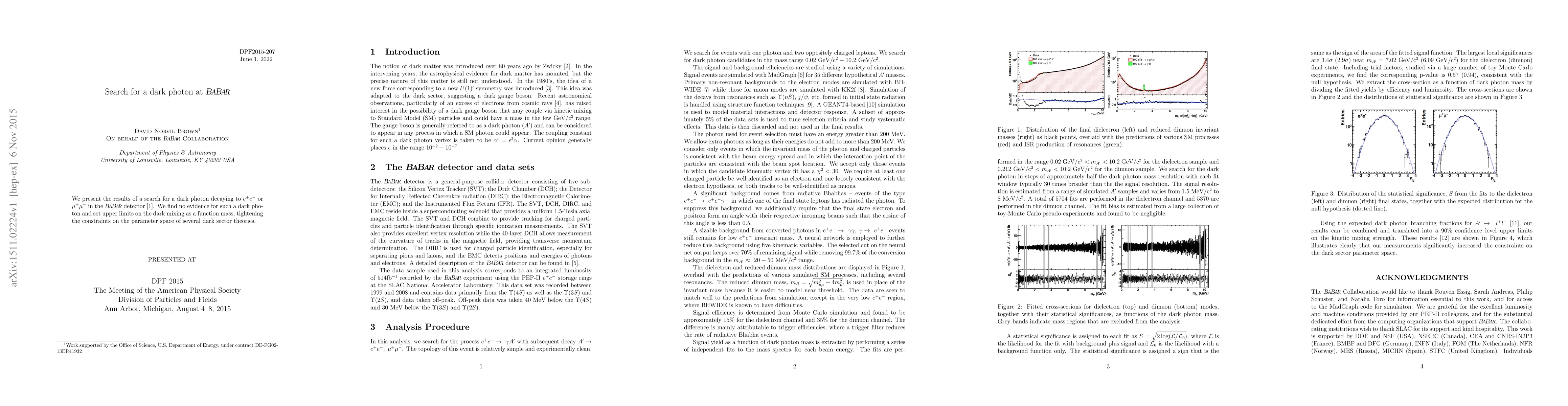 The BABAR experiment searched for a dark photon decaying into electron-positron or muon-muon pairs but found no evidence for its existence, thereby tightening constraints on dark sector theories. Upper limits on dark mixing were established as a function of the dark photon's mass.