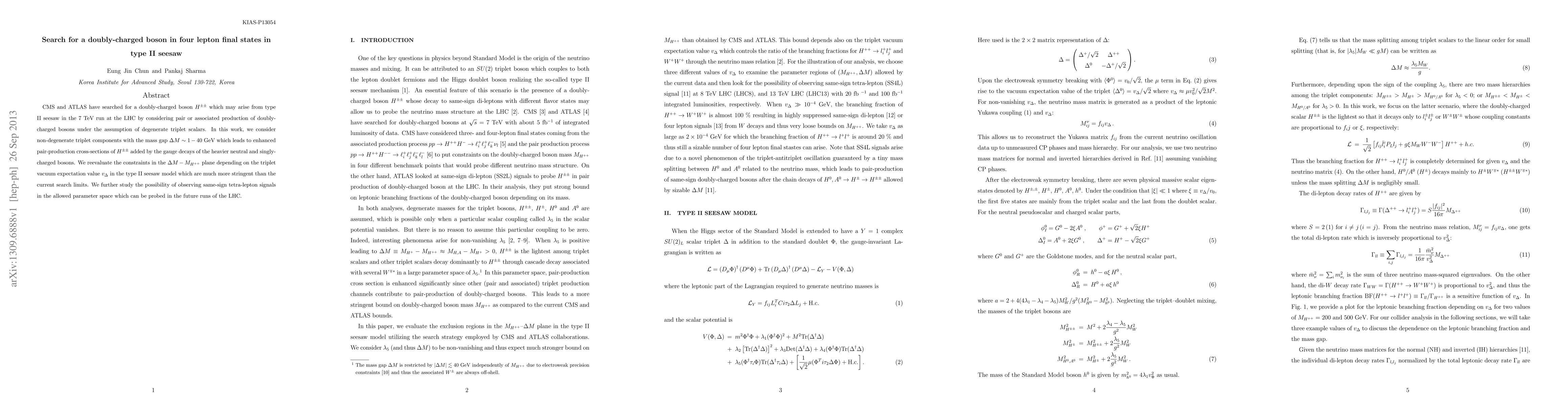 CMS and ATLAS have searched for a doubly-charged boson $H^{\pm\pm}$ which may arise from type II seesaw in the 7 TeV run at the LHC by considering pair or associated production of doubly-charged bosons under the assumption of degenerate triplet scalars. In this work, we consider non-degenerate triplet components with the mass gap $\Delta M \sim 1 - 40$ GeV which leads to enhanced pair-production cross-sections of $H^{\pm\pm}$ added by the gauge decays of the heavier neutral and singly-charged bosons. We reevaluate the constraints in the $\Delta M-M_{H^{++}}$ plane depending on the triplet vacuum expectation value $v_\Delta$ in the type II seesaw model which are much more stringent than the current search limits. We further study the possibility of observing same-sign tetra-lepton signals in the allowed parameter space which can be probed in the future runs of the LHC.