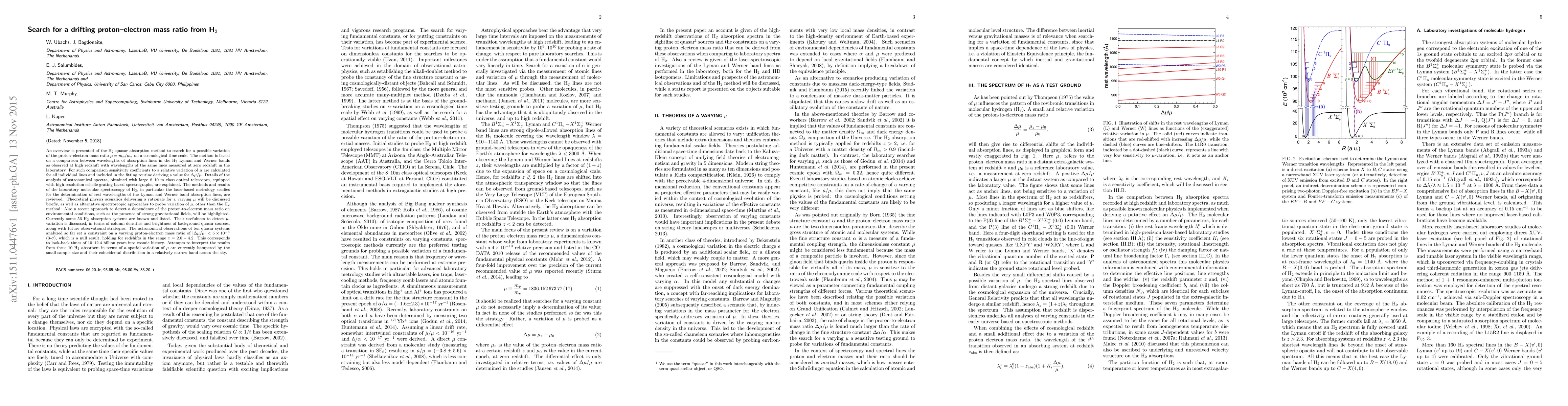 Astronomers searched for variations in the proton-electron mass ratio using H2 quasar absorption spectra, finding no evidence of a variation with a constraint of $| Delmu/ u| < 5 imes 10^{-6}$ over look-back times of 10-12.4 billion years.