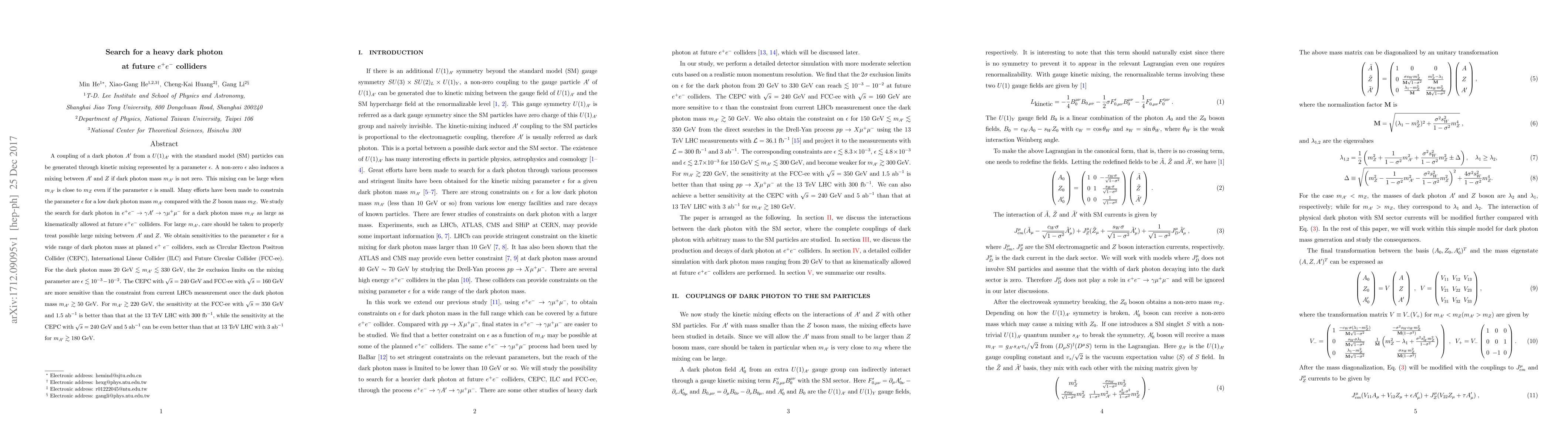 This paper investigates the search for a heavy dark photon $A'$ at future $e^+e^-$ colliders, focusing on the kinetic mixing parameter $\epsilon$ and its potential mixing with the $Z$ boson. The study finds that CEPC, ILC, and FCC-ee colliders will significantly improve the exclusion limits on $\epsilon$ for dark photon masses up to 330 GeV, surpassing current LHCb constraints.