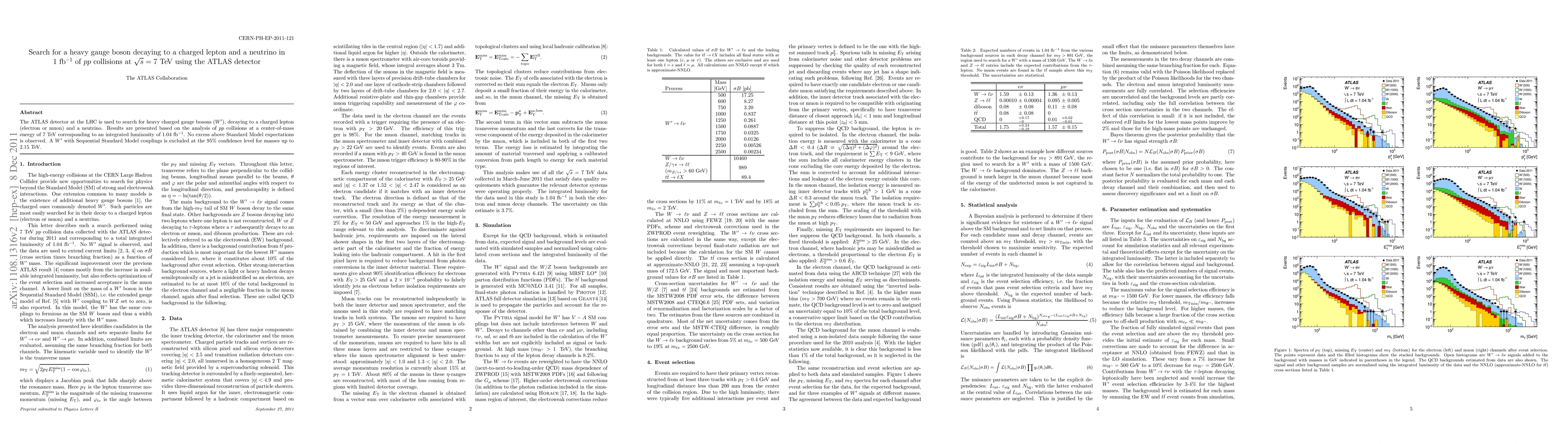Summary: The ATLAS detector analyzed 1 fb^-1 of pp collisions at 7 TeV to search for heavy gauge bosons (W') decaying into charged leptons and neutrinos, but no significant excess was found. W' bosons with Sequential Standard Model couplings are excluded up to a mass of 2.15 TeV at 95% confidence level.