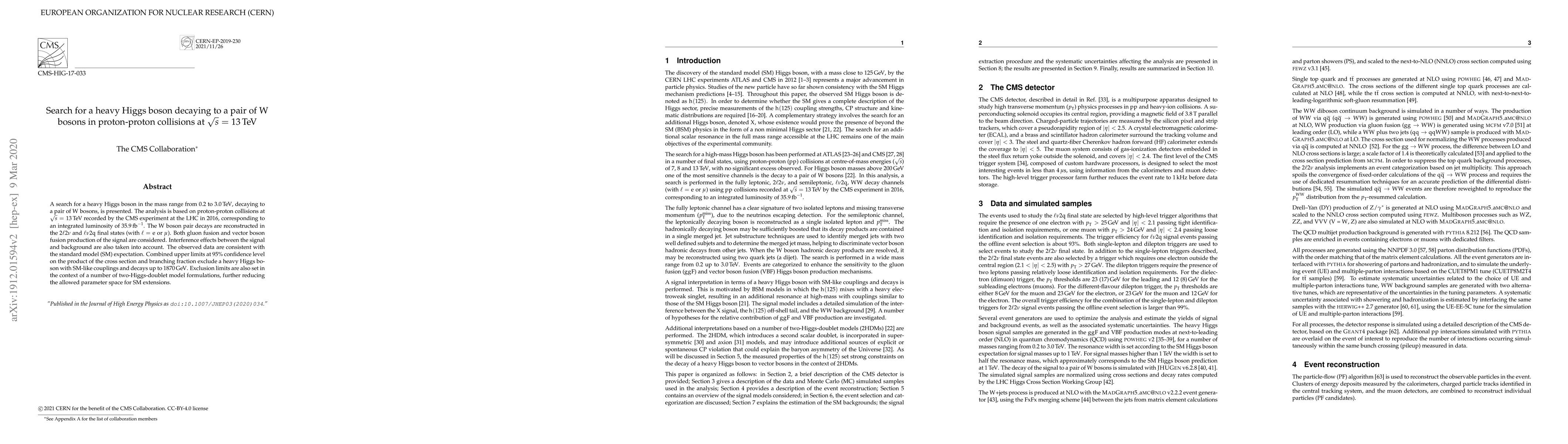 Researchers searched for a heavy Higgs boson decaying to W bosons in proton-proton collisions at 13 TeV and found no evidence of such a particle, setting an upper limit on its mass and confirming the Standard Model expectation.