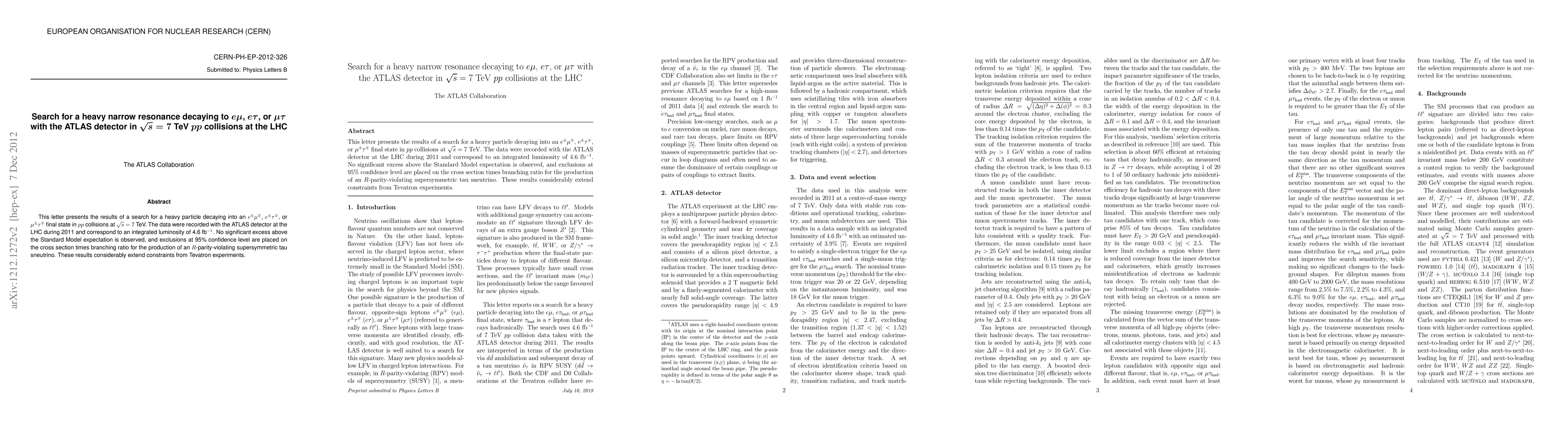 This paper reports on a search for a heavy resonance decaying into e mu, e tau, or mu tau final states using the ATLAS detector at the LHC, finding no significant excess above Standard Model predictions. The results exclude the production of an R-parity-violating supersymmetric tau sneutrino, extending previous constraints from Tevatron experiments.
