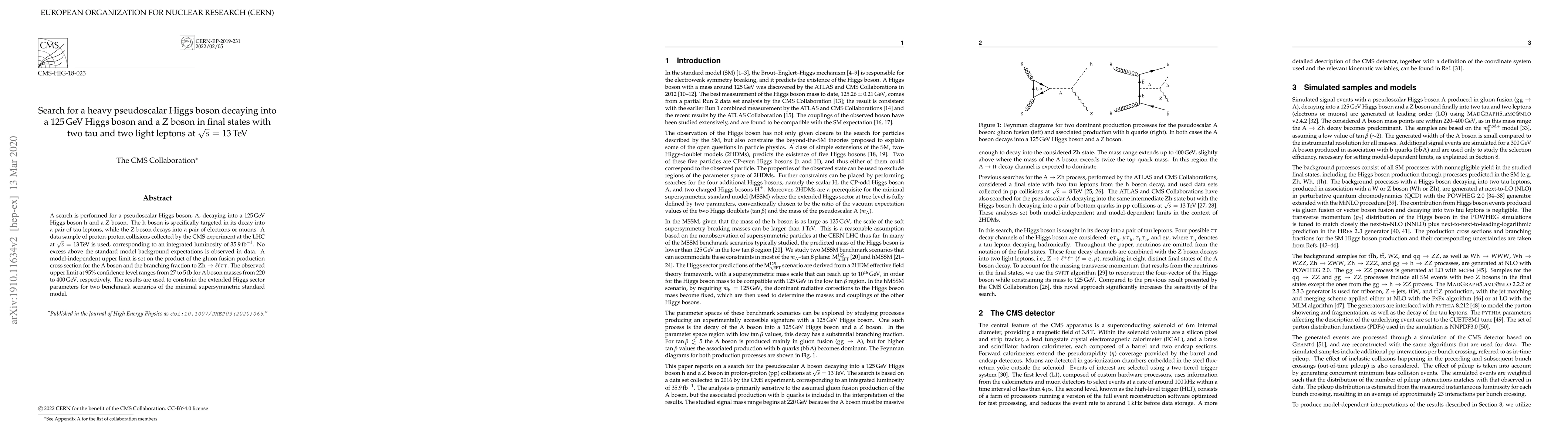This paper investigates the decay of a heavy pseudoscalar Higgs boson into a 125 GeV Higgs boson and a Z boson, focusing on final states with two tau and two light leptons. No significant excess is observed, leading to model-independent upper limits on the production cross section and branching fraction for A boson masses ranging from 220 to 400 GeV.