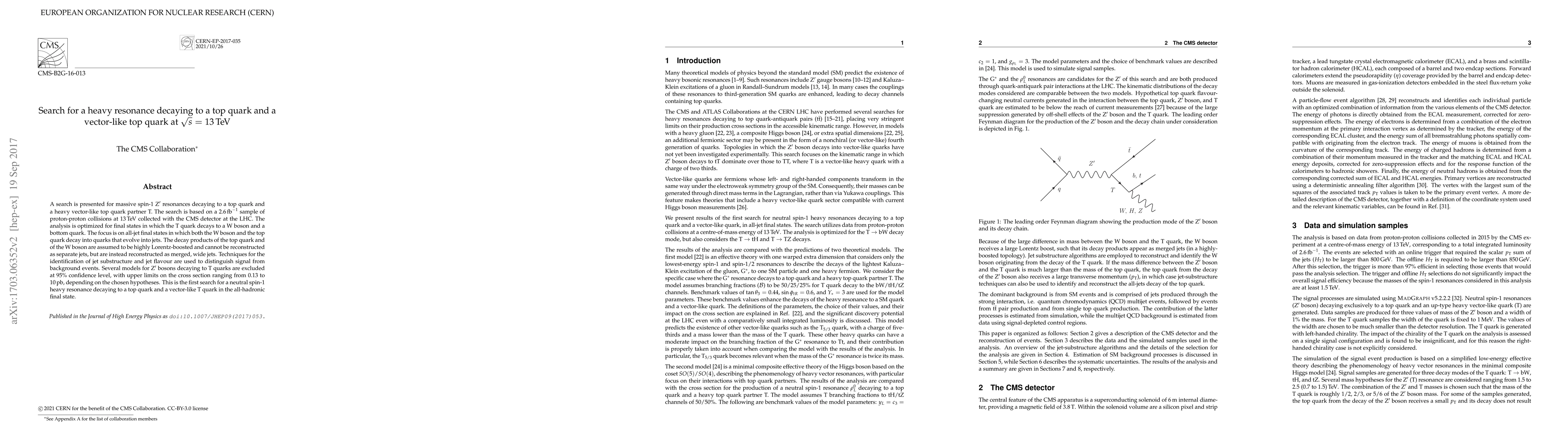This paper investigates the presence of a heavy Z' resonance decaying into a top quark and a vector-like top quark partner T, using data from proton-proton collisions at 13 TeV. The CMS detector at the LHC analyzed 2.6 inverse femtobarns of data, focusing on all-jet final states to identify the decay products as merged wide jets. No evidence of the Z' resonance was found, leading to exclusion of several models at 95% confidence level.