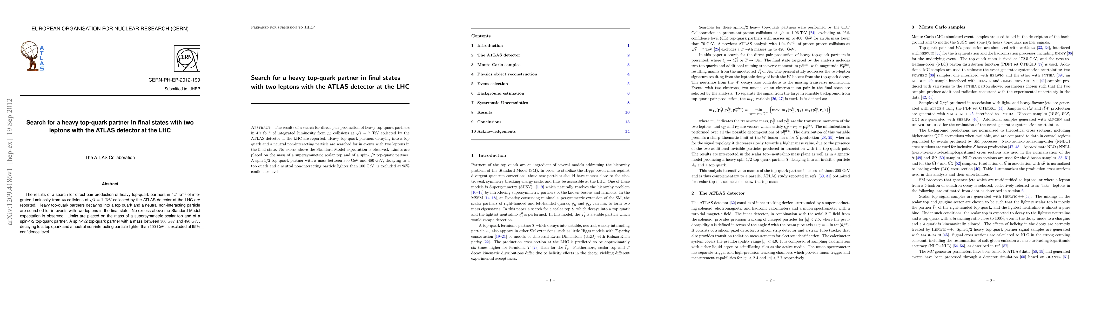 The results of a search for direct pair production of heavy top-quark partners in 4.7 fb-1 of integrated luminosity from pp collisions at sqrt(s) = 7 TeV collected by the ATLAS detector at the LHC are reported. Heavy top-quark partners decaying into a top quark and a neutral non-interacting particle are searched for in events with two leptons in the final state. No excess above the Standard Model expectation is observed. Limits are placed on the mass of a supersymmetric scalar top and of a spin-1/2 top-quark partner. A spin-1/2 top-quark partner with a mass between 300 GeV and 480 GeV, decaying to a top quark and a neutral non-interacting particle lighter than 100 GeV, is excluded at 95% confidence level.