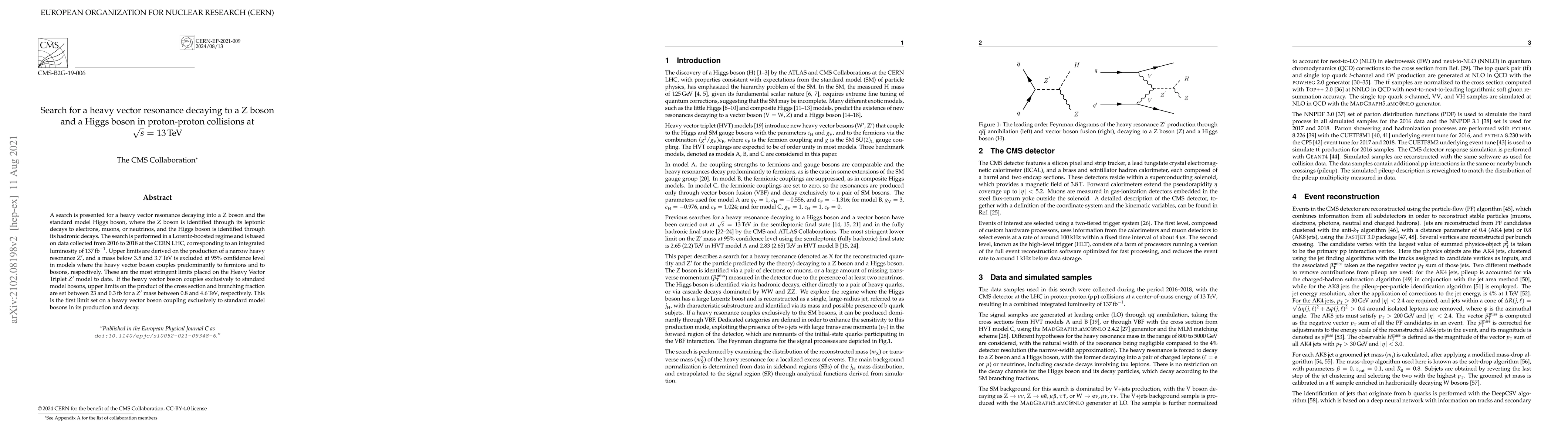 This paper reports a search for a heavy vector resonance Z' decaying into a Z boson and a Higgs boson in proton-proton collisions at 13 TeV, using data from the CERN LHC. It sets the most stringent limits to date, excluding a Z' mass below 3.5-3.7 TeV at 95% confidence level, depending on its coupling type.