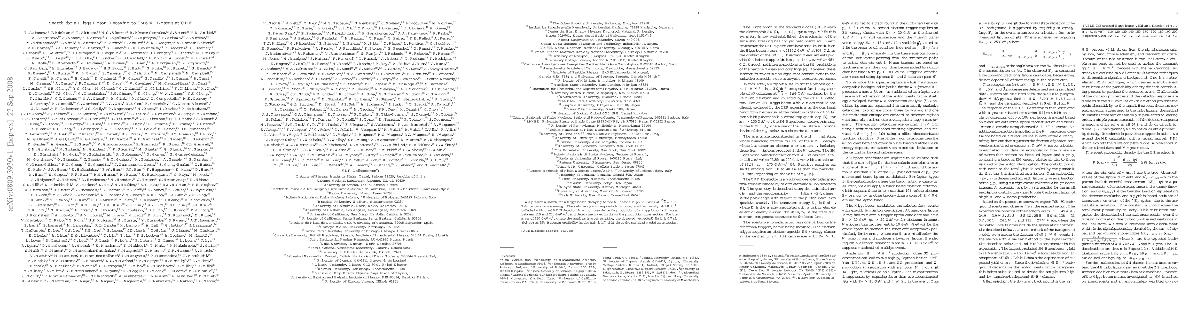 This study investigates Higgs boson decay into two W bosons using CDF II detector data at 1.96 TeV center-of-mass energy, finding no evidence for Higgs masses between 110 and 200 GeV/c², with the most sensitive limit at 160 GeV/c² being 0.7 pb observed and 0.9 pb expected.