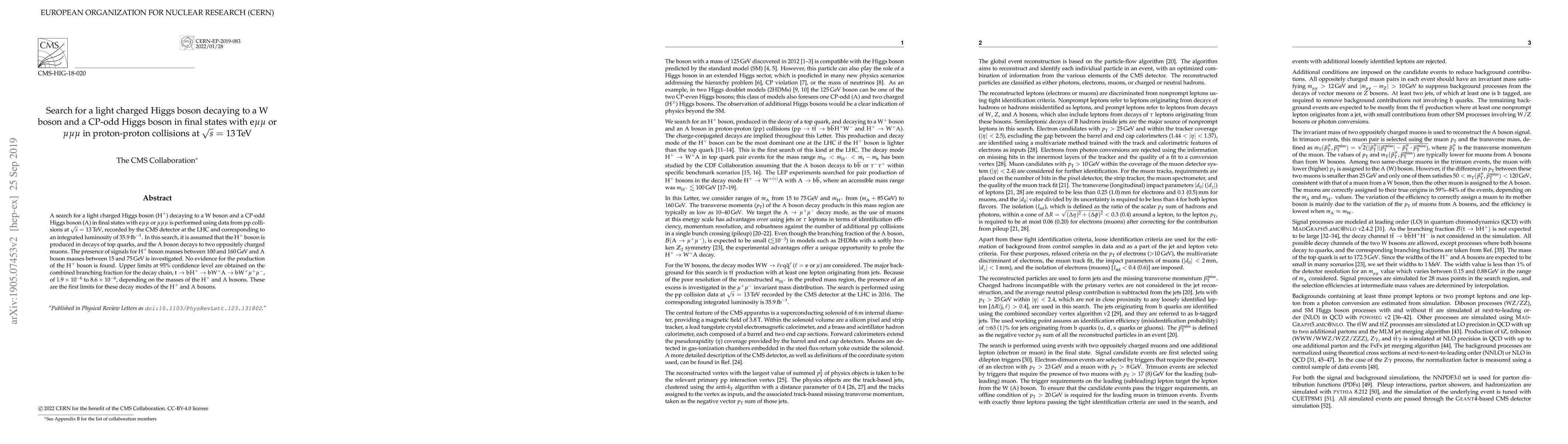 This paper reports a search for a light charged Higgs boson (H$^+$) decaying to a W boson and a CP-odd Higgs boson (A) in proton-proton collisions at 13 TeV using the CMS detector data. No evidence for H$^+$ production is found, and new upper limits on the decay branching fraction are established for the first time.
