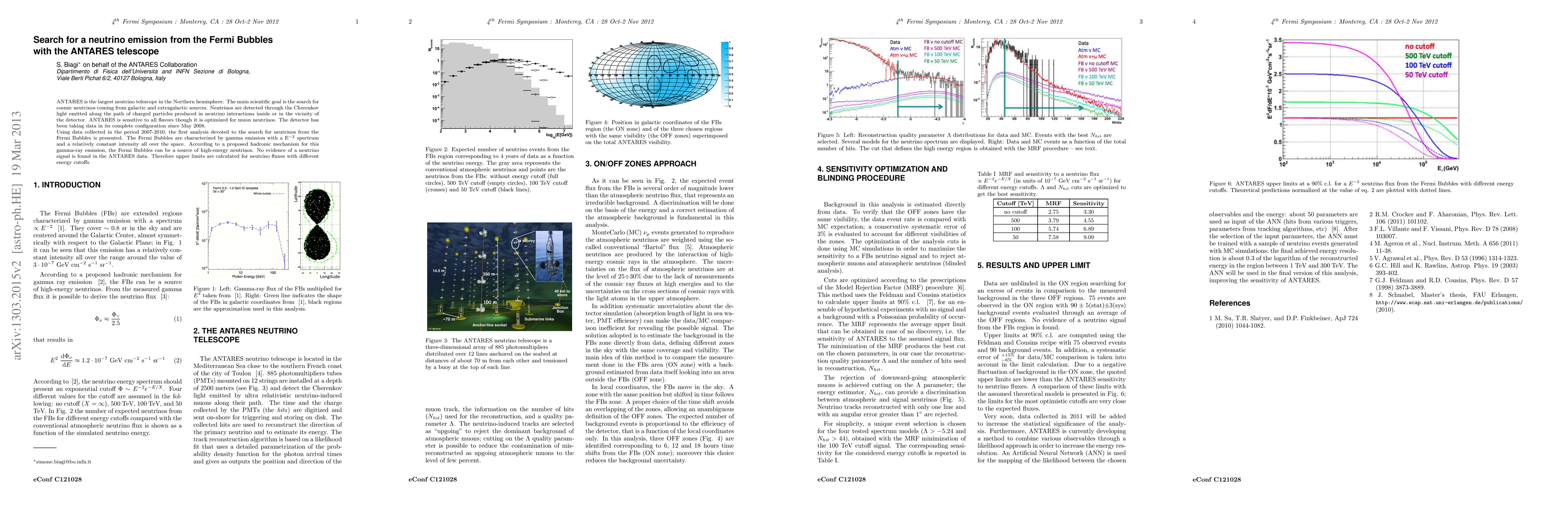 The ANTARES telescope analyzed data from 2007-2010 to search for neutrinos from the Fermi Bubbles, but found no evidence of a neutrino signal. Upper limits on neutrino fluxes were established for various energy cutoffs.