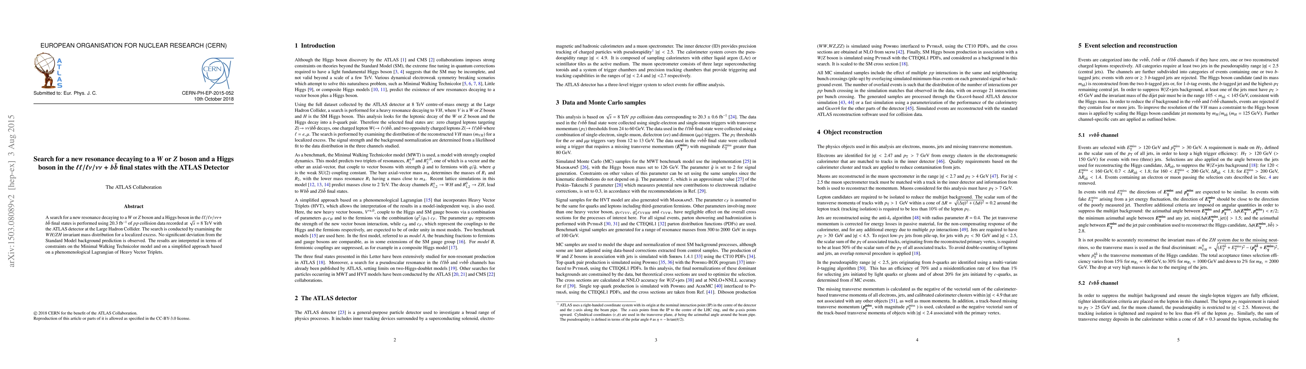 A search for a new resonance decaying to a $W$ or $Z$ boson and a Higgs boson in the $\ell \ell/ \ell \nu/ \nu \nu + b \bar{b}$ final states is performed using 20.3 fb$^{-1}$ of $pp$ collision data recorded at $\sqrt{s}=$ 8 TeV with the ATLAS detector at the Large Hadron Collider. The search is conducted by examining the $WH/ZH$ invariant mass distribution for a localized excess. No significant deviation from the Standard Model background prediction is observed. The results are interpreted in terms of constraints on the Minimal Walking Technicolor model and on a simplified approach based on a phenomenological Lagrangian of Heavy Vector Triplets.