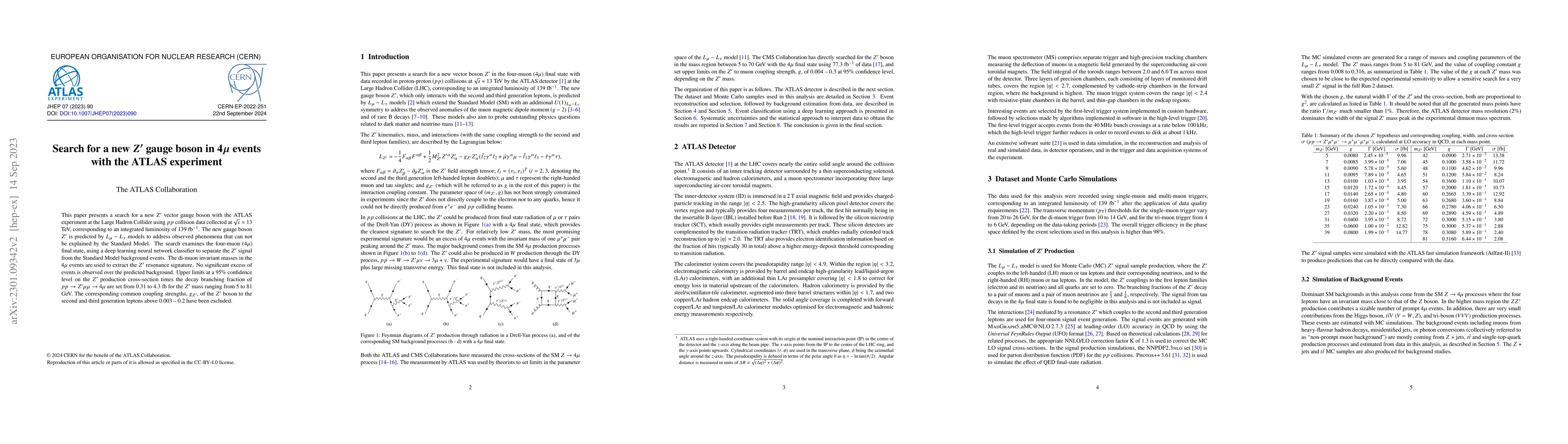 This paper reports a search for a new Z' gauge boson using four-muon events in the ATLAS experiment at the LHC, finding no significant excess over Standard Model predictions. Upper limits on the Z' production cross-section and coupling strengths are established, excluding certain values for the Z' boson's mass and interactions.