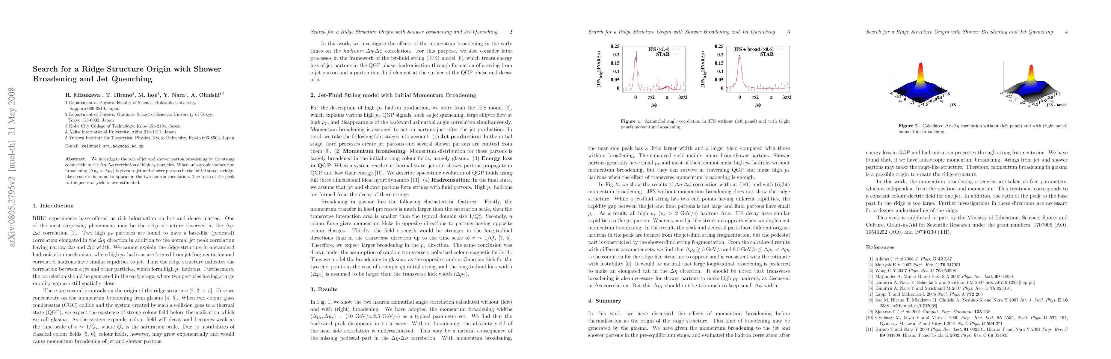 Researchers found that adding broadening to jet and shower partons in high-energy collisions creates a ridge structure in two-particle correlations, which overestimates the peak-to-pedestal yield ratio.