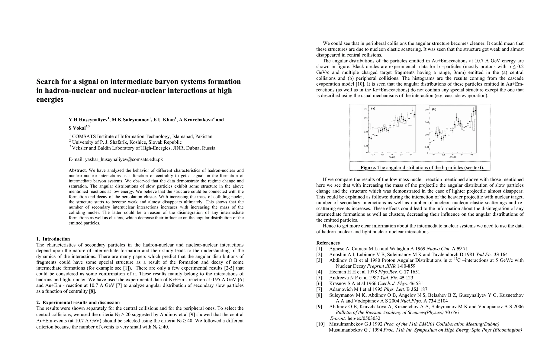 We have analyzed the behavior of different characteristics of hadron-nuclear and nuclear-nuclear interactions as a function of centrality to get a signal on the formation of intermediate baryon systems. We observed that the data demonstrate the regime change and saturation. The angular distributions of slow particles exhibit some structure in the above mentioned reactions at low energy. We believe that the structure could be connected with the formation and decay of the percolation cluster. With increasing the mass of colliding nuclei, the structure starts to become weak and almost disappears ultimately. This shows that the number of secondary internuclear interactions increases with increasing the mass of the colliding nuclei. The latter could be a reason of the disintegration of any intermediate formations as well as clusters, which decrease their influence on the angular distribution of the emitted particles.