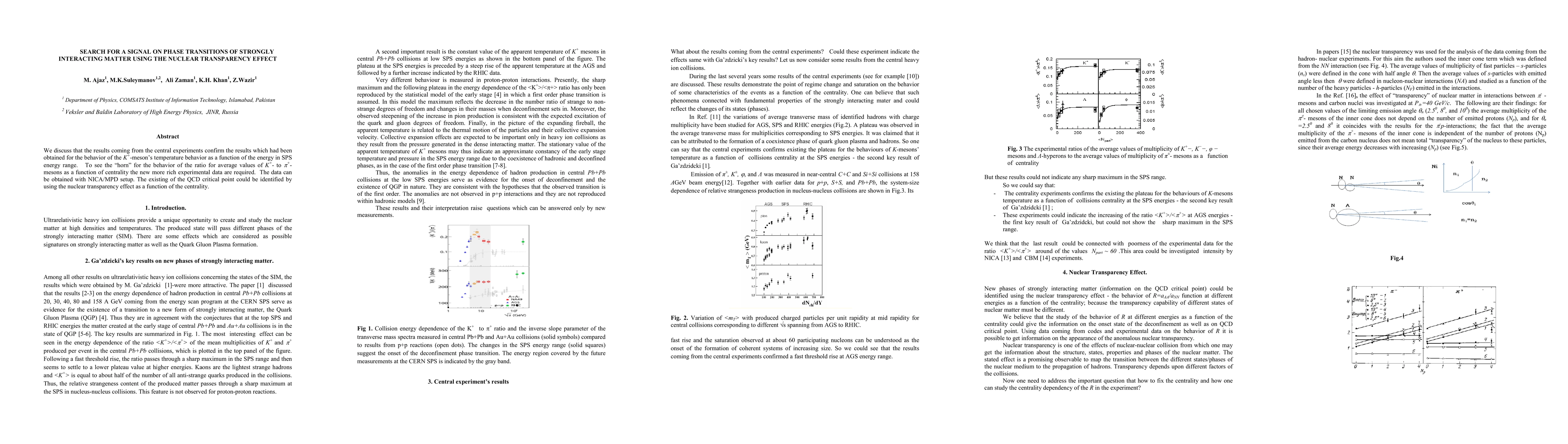 We discuss that the results coming from the central experiments confirm the results which had been obtained for the behavior of the K+-meson's temperature behavior as a function of the energy in SPS energy range. To see the "horn" for the behavior of the ratio for average values of K+- to pi+- mesons as a function of centrality the new more rich experimental data are required. The data can be obtained with NICA/MPD setup. The existing of the QCD critical point could be identified by using the nuclear transparency effect as a function of the centrality.