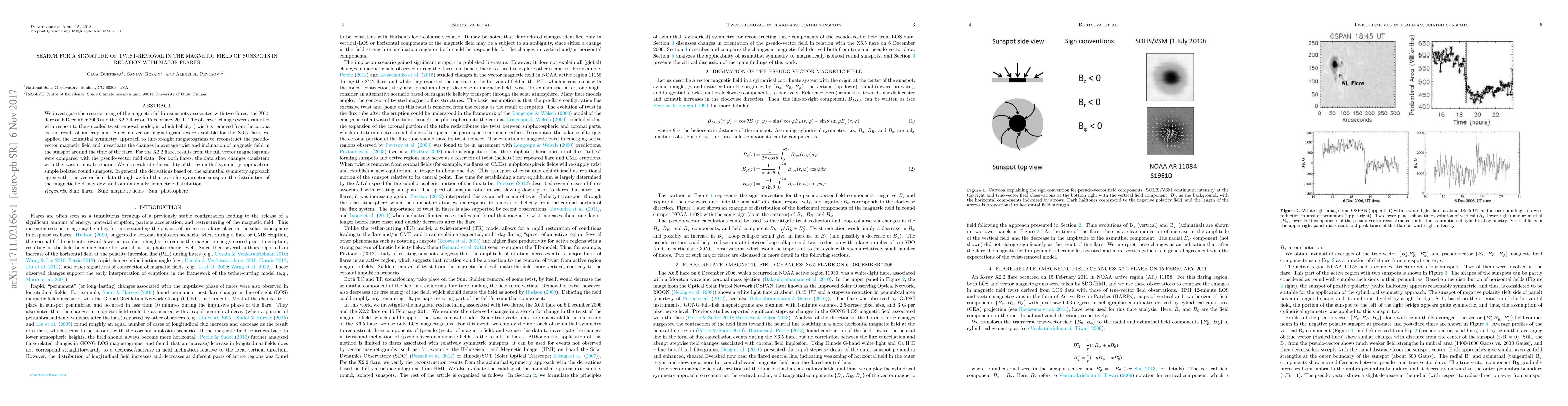 We investigate the restructuring of the magnetic field in sunspots associated with two flares: the X6.5 flare on 6 December 2006 and the X2.2 flare on 15 February 2011. The observed changes were evaluated with respect to the so-called twist-removal model, in which helicity (twist) is removed from the corona as the result of an eruption. Since no vector magnetograms were available for the X6.5 flare, we applied the azimuthal symmetry approach to line-of-sight magnetograms to reconstruct the pseudo-vector magnetic field and investigate the changes in average twist and inclination of magnetic field in the sunspot around the time of the flare. For the X2.2 flare, results from the full vector magnetograms were compared with the pseudo-vector field data. For both flares, the data show changes consistent with the twist-removal scenario. We also evaluate the validity of the azimuthal symmetry approach on simple isolated round sunspots. In general, the derivations based on the azimuthal symmetry approach agree with true-vector field data though we find that even for symmetric sunspots the distribution of the magnetic field may deviate from an axially symmetric distribution.