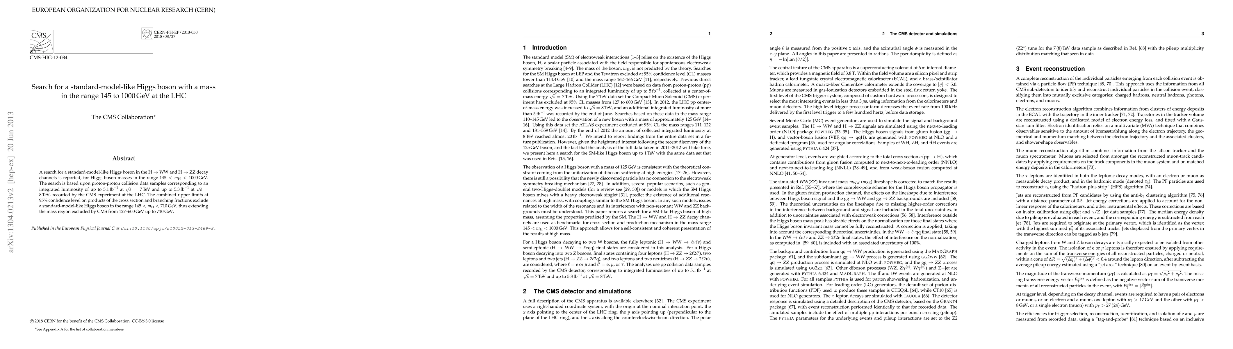This paper reports a search for a standard-model-like Higgs boson in the mass range 145 to 1000 GeV using the CMS experiment at the LHC, finding no evidence of such a boson and excluding it in the range 145 to 710 GeV. This extends previous exclusion limits up to 710 GeV.