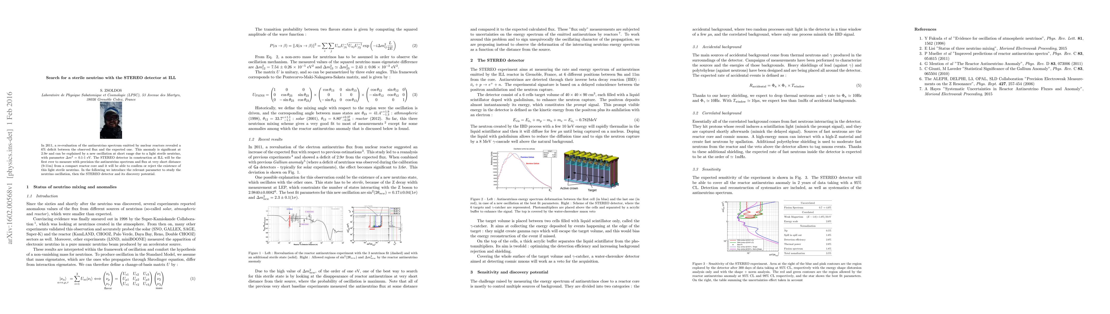 This paper discusses the potential of the STEREO detector at ILL to confirm or refute the existence of a light sterile neutrino, proposed to explain a 6% deficit in observed antineutrino flux from nuclear reactors, a phenomenon significant at 2.9$\sigma$. The STEREO detector aims to precisely measure the antineutrino spectrum and flux at short distances to validate this new oscillation mechanism.