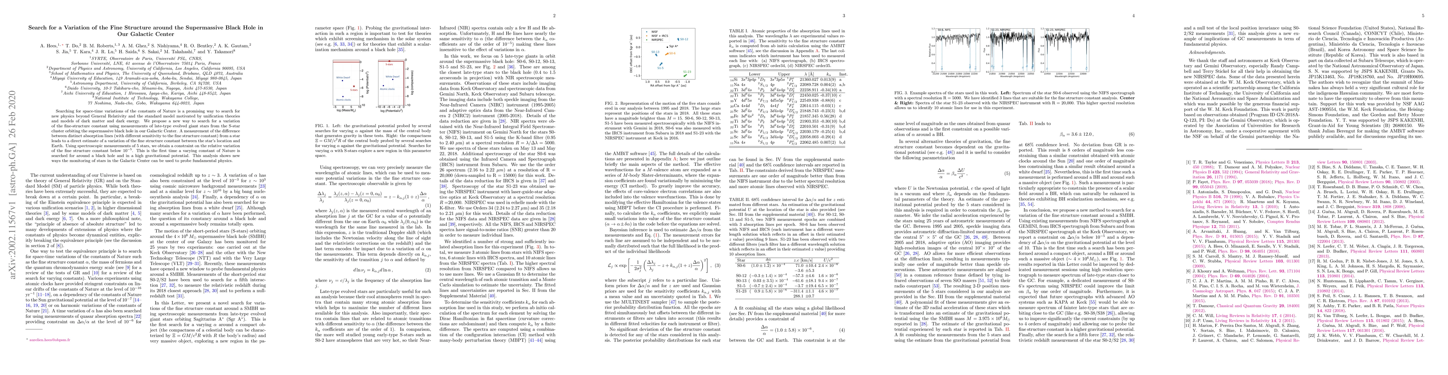 Searching for space-time variations of the constants of Nature is a promising way to search for new physics beyond General Relativity and the standard model motivated by unification theories and models of dark matter and dark energy. We propose a new way to search for a variation of the fine-structure constant using measurements of late-type evolved giant stars from the S-star cluster orbiting the supermassive black hole in our Galactic Center. A measurement of the difference between distinct absorption lines (with different sensitivity to the fine structure constant) from a star leads to a direct estimate of a variation of the fine structure constant between the star's location and Earth. Using spectroscopic measurements of 5 stars, we obtain a constraint on the relative variation of the fine structure constant below $10^{-5}$. This is the first time a varying constant of Nature is searched for around a black hole and in a high gravitational potential. This analysis shows new ways the monitoring of stars in the Galactic Center can be used to probe fundamental physics.